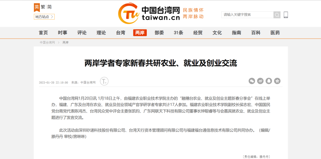 中国台湾网1月20日讯 1月18日上午,由bat365在线登录网站注册赠送36主办的“融穗台农业、就业及创业主题新春分享会”在线上举办,福建、广东及台湾在农业、就业及创业领域产官学研学者专家共计17人参加。bat365在线登录网站注册赠送36副校长侯志宏、中国国民党台商党代表陈鸿杰、台湾民众党中评会主委张凯钧、广东网联天下科技有限公司董事长钟聪睿等与会嘉宾就农业、就业及创业主题进行了发言交流。