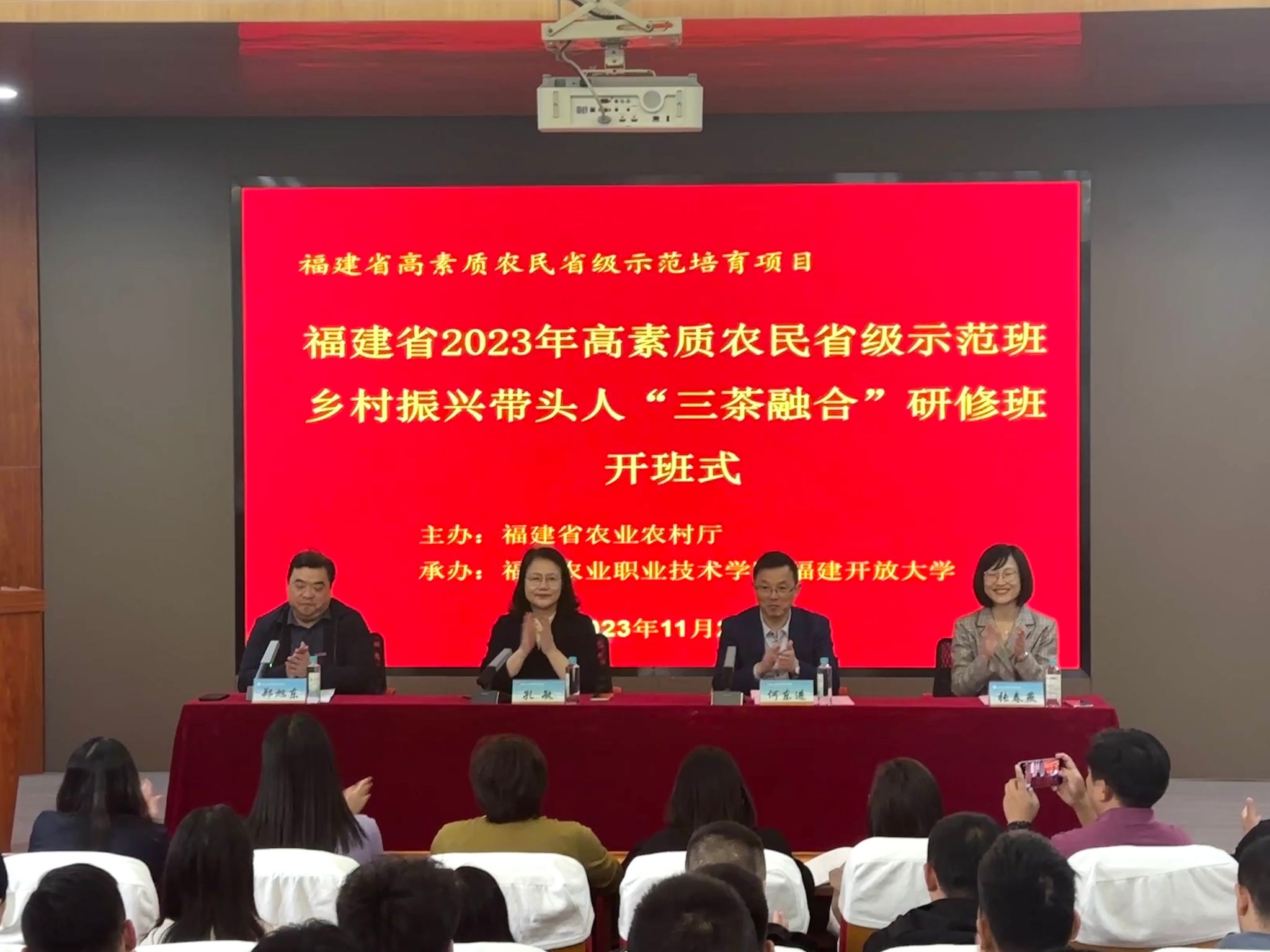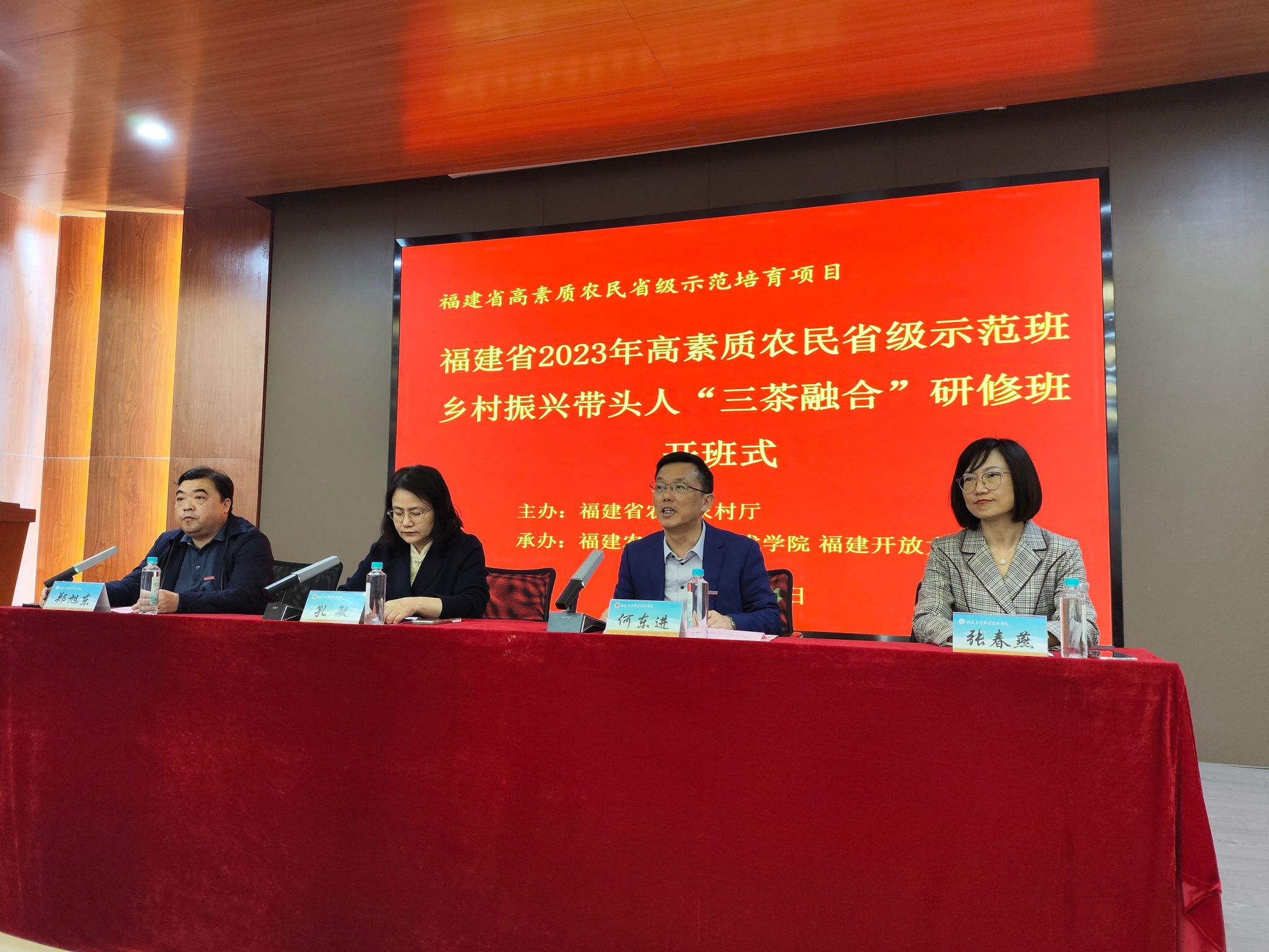 党的二十大报告提出“全面推进乡村振兴”,强调“加快推进农业农村现代化”。为深入贯彻落实习近平总书记有关乡村人才振兴的重要指示精神,大力实施高素质农民培育计划,着力培养一支懂技术、善经营、会管理的高素质农民队伍。11月24日上午,由福建省农业农村厅主办,bat365在线登录网站注册赠送36承办的省级示范班乡村振兴带头人“三茶融合”研修班开班式在bat365在线登录网站注册赠送36首山校区举行。开班仪式由现代农业培训学院院长郑旭东主持。
