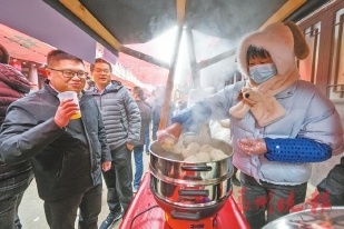 八闽美食嘉年华区域,在20个侯官特色美食摊位上,陆续摆上炒糕、年糕、萝卜糕、鱼丸、锅边、炖罐、花生汤等地道侯官味;在闽侯14个乡镇“一镇一品”美食摊位上,呈上乡亲们精心挑选出的青红酒、橄榄、脐橙、礼饼、甘蔗、绣球菌等乡村好物……叫卖声此起彼伏,摊位前门庭若市。