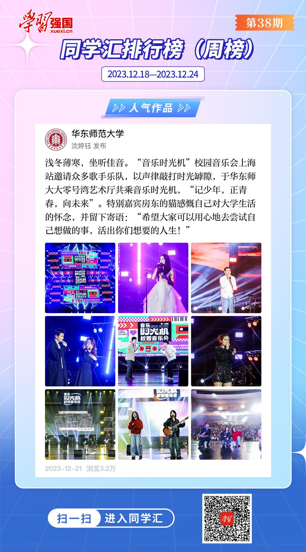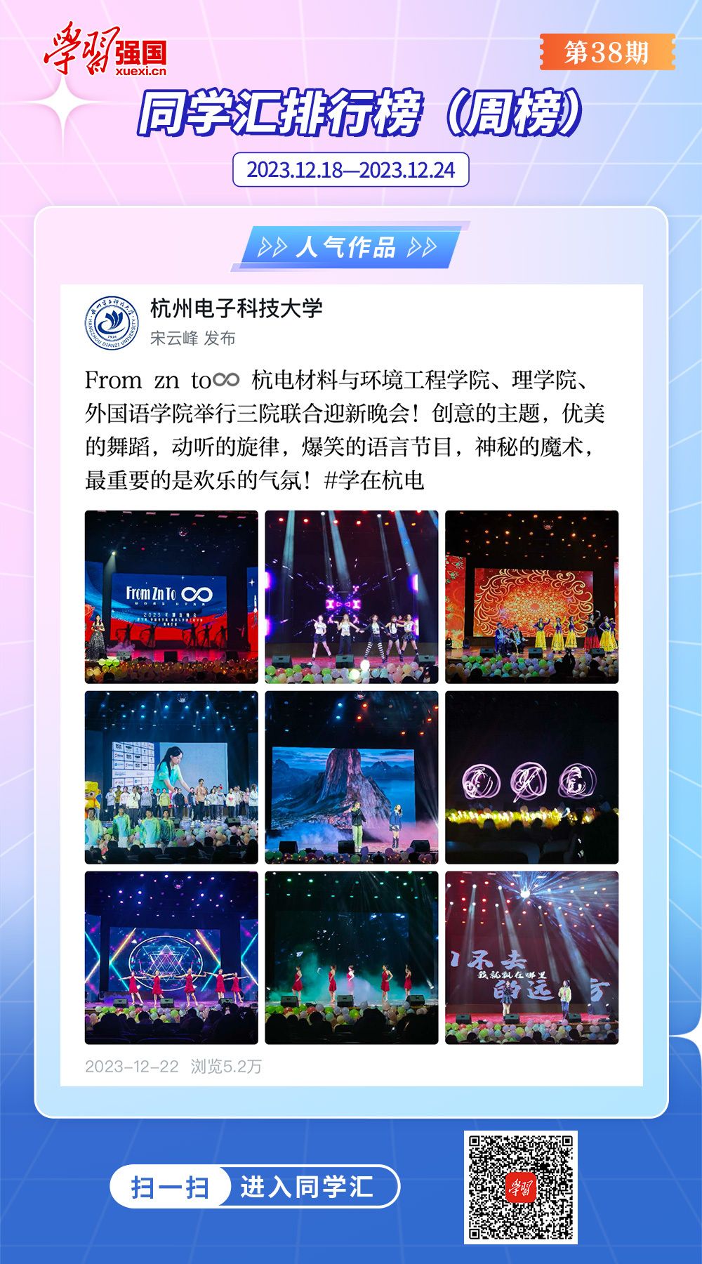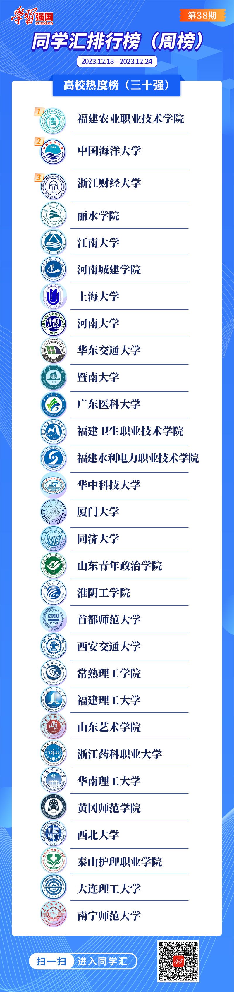 1月3日,“学习强国”同学汇工作室发布第38期周排行榜(2023.12.18—12.24),bat365在线登录网站注册赠送36凭借超高的加入人数荣登榜首,中国海洋大学获得亚军,浙江财经大学首次位列前三。