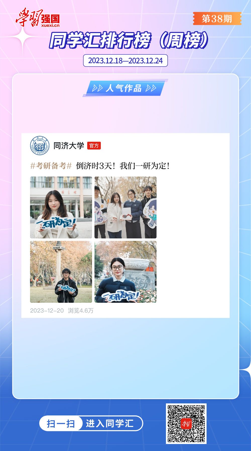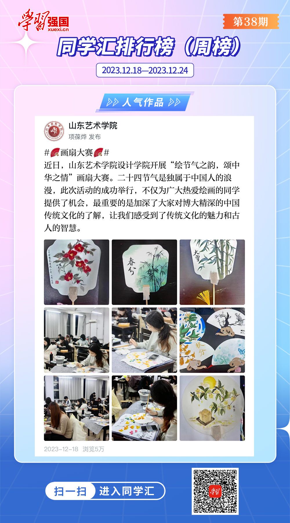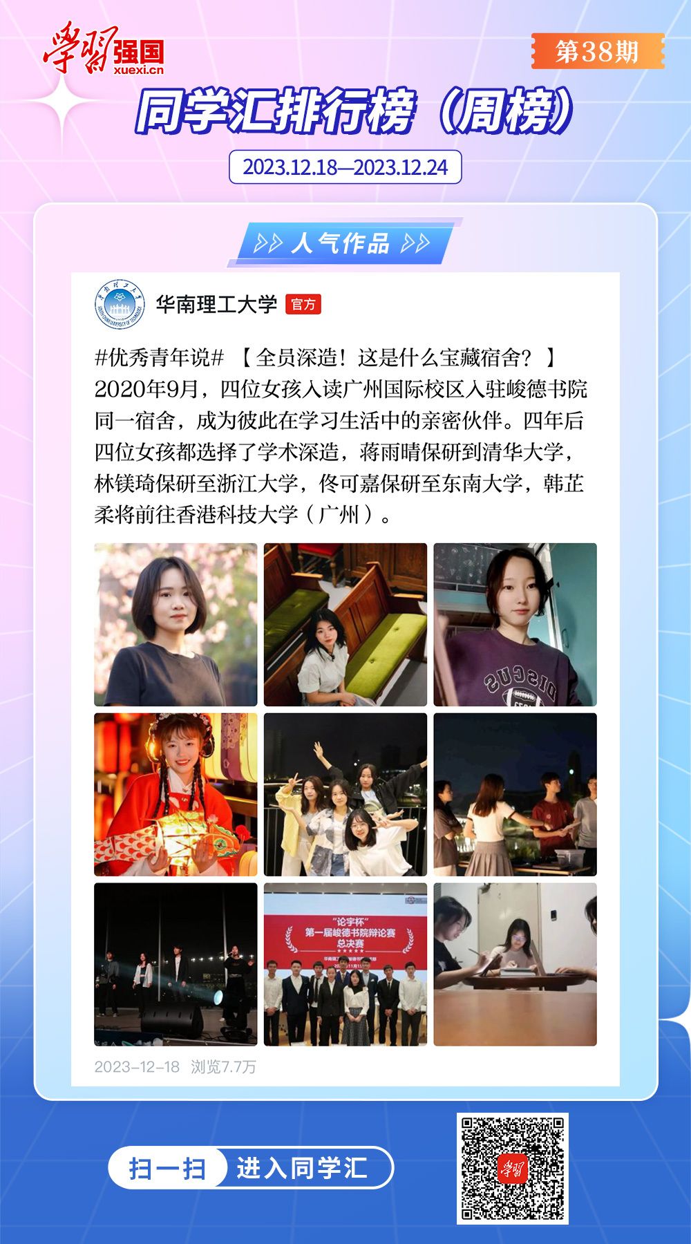 人气作品方面,华南理工大学同宿舍四位女孩全员读研,成为彼此学习生活中的亲密伙伴;杭州电子科技大学迎新晚会热浪来袭,快乐氛围拉满;山东艺术学院“绘节气之韵,颂中华之情”画扇大赛,绘出二十四节气之美;“钱学森纪念园”在西安交通大学创新港落成,成为西安交大文化育人“新地标”;同济大学、西安音乐学院为考研学子加油鼓劲;江苏科技大学、南京医科大学雪后校园美不胜收,邀请大家前去打卡。