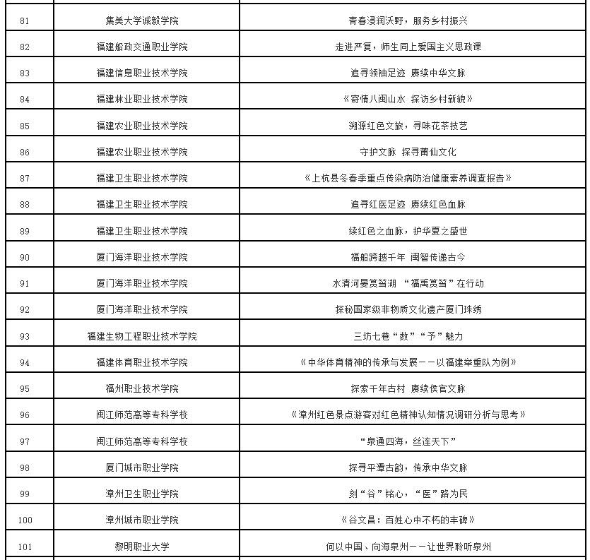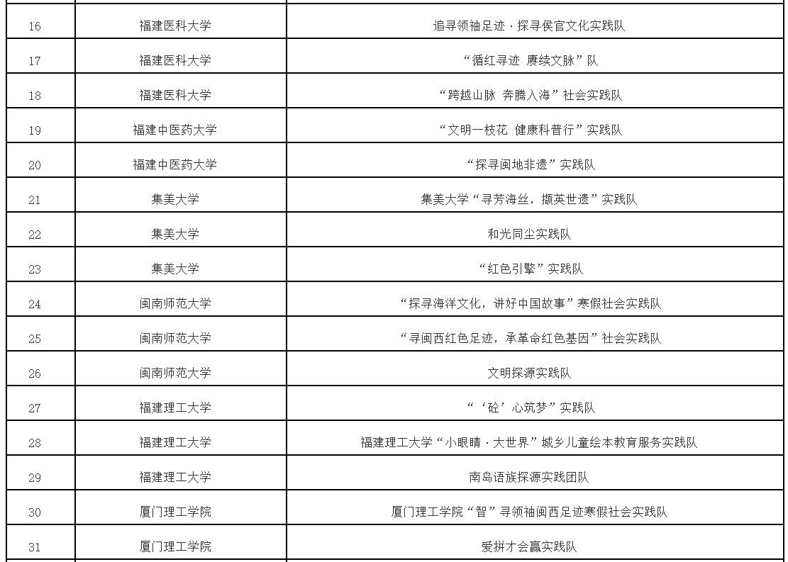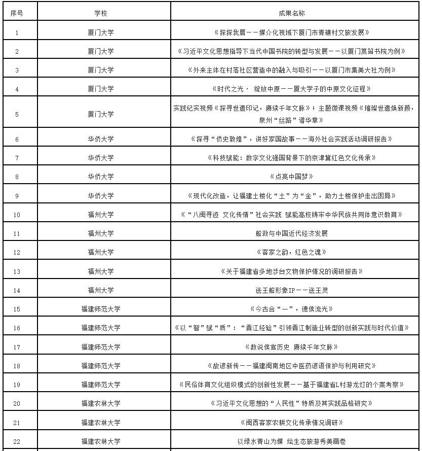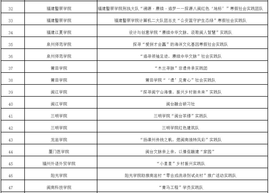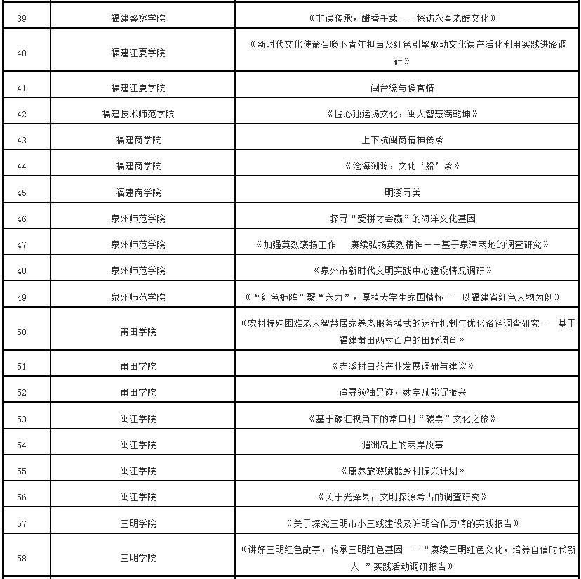 根据《中共福建省委教育工委办公室关于组织开展“追寻领袖足迹 赓续中华文脉”2023—2024学年全省大学生寒假主题社会实践活动的通知》(闽委教办思〔2024〕1号)精神,经高校推荐、专家评审等程序,拟评选优秀组织奖20个、优秀实践团队70个、优秀实践个人115名、优秀实践成果115项。现将拟获奖名单予以公示。