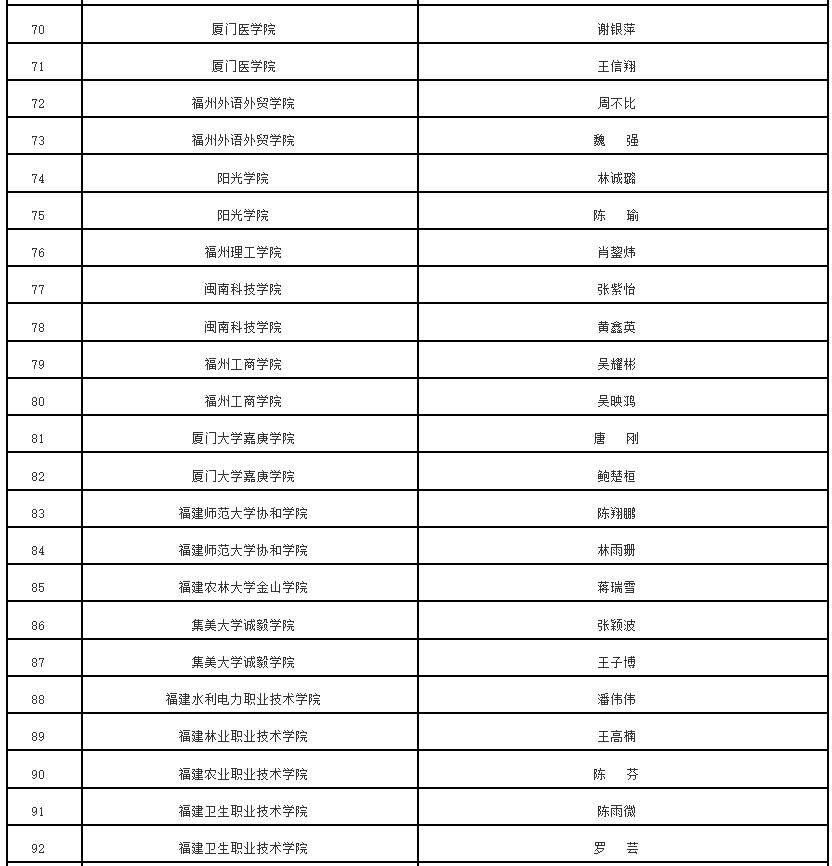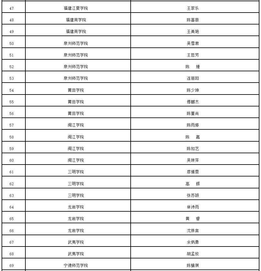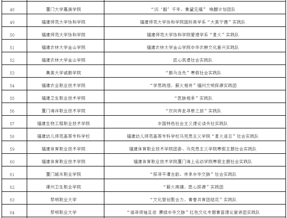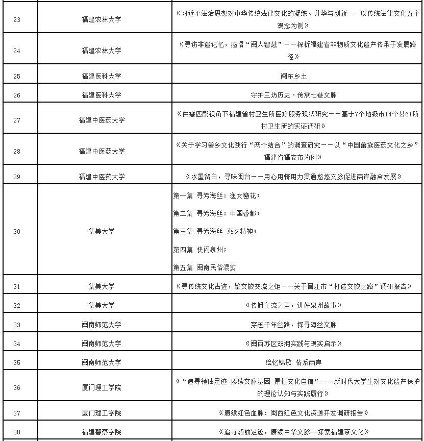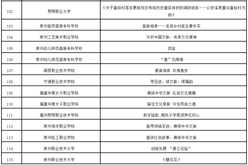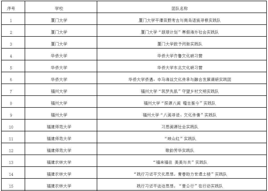 根据《中共福建省委教育工委办公室关于组织开展“追寻领袖足迹 赓续中华文脉”2023—2024学年全省大学生寒假主题社会实践活动的通知》(闽委教办思〔2024〕1号)精神,经高校推荐、专家评审等程序,拟评选优秀组织奖20个、优秀实践团队70个、优秀实践个人115名、优秀实践成果115项。现将拟获奖名单予以公示。