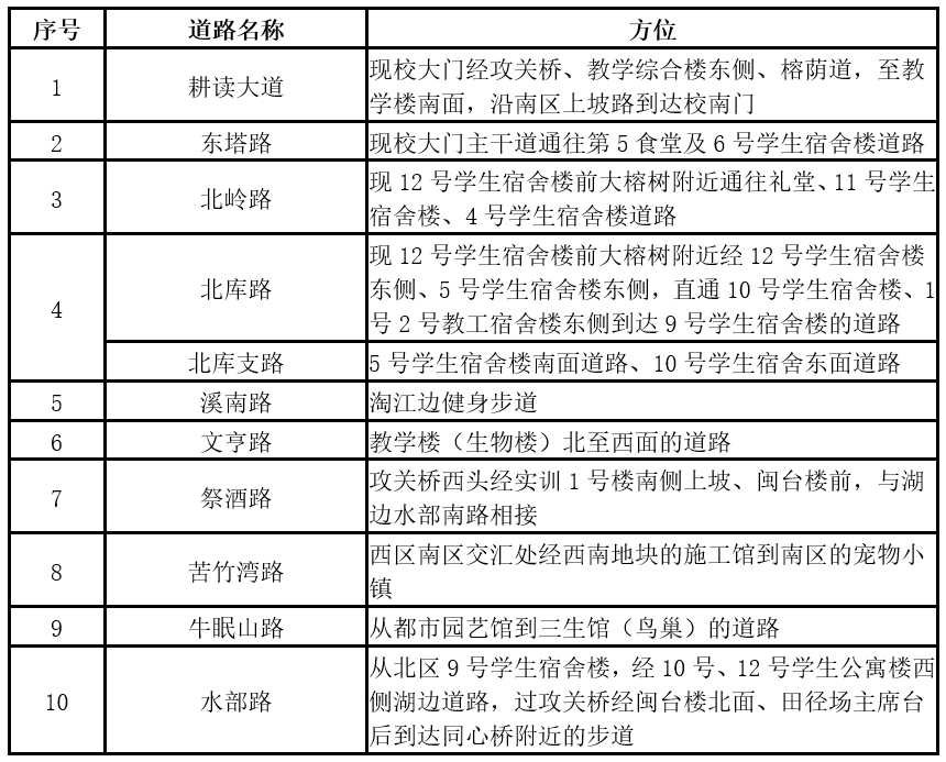 此案共命名13条道路,涵盖相思岭校区完整道路地图,路名包括耕读大道、东塔路、北岭路、北库路、永安路、溪南路、文亨路、神农路、祭酒岭路、苦竹湾路、牛眠山路、墘上里路、湖滨路。命名选用学校历史上的主要办学地址和农业特色名词,对于回望120年走过的路程、弘扬bat365精神、增强历史自信、激发全体师生的凝聚力具有极大的意义。同时,根据校园道路实际需要,待加工可利用的路名还有如蚕桑路、培元路、贤良路、施埔路、长乐路、东星路、南港路等。另外,建筑及设施可利用的名称如桑拓馆、耕余楼、丰登楼、澄澜阁(亭)、望北台、荷亭、古仙桥、步云桥等。