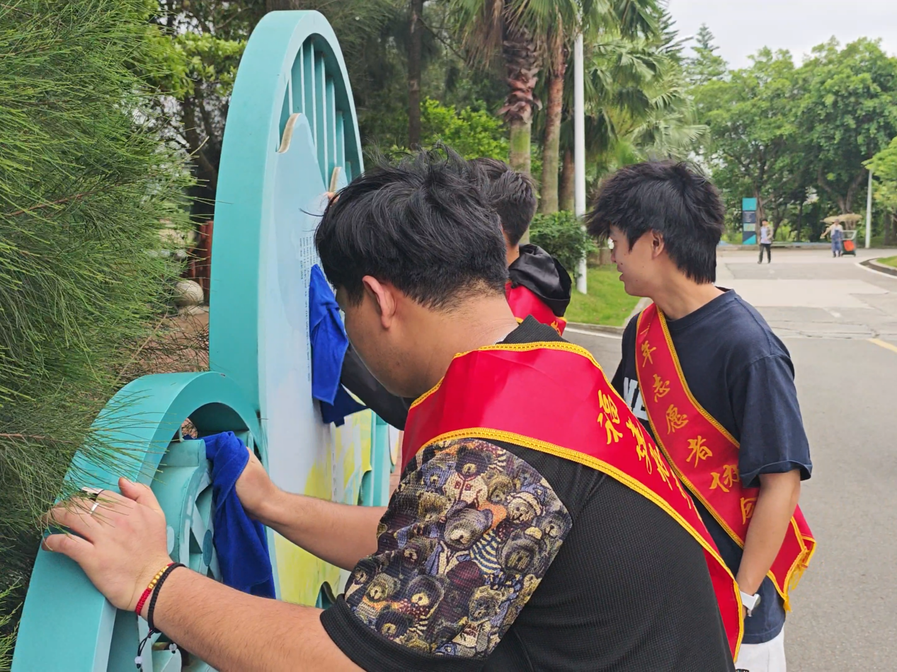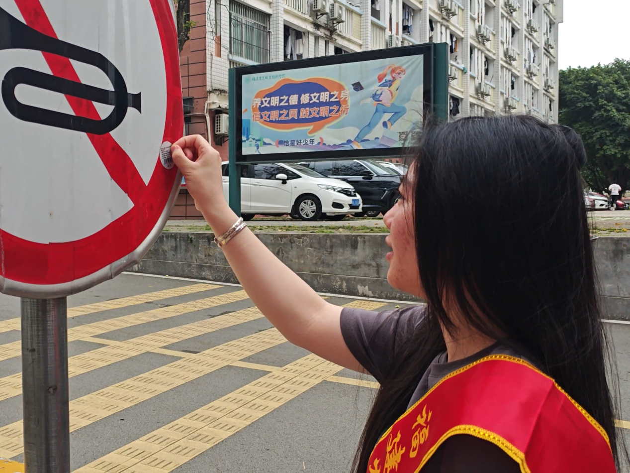 在院部另一侧,第四小组专注清洁校园公共设施。他们提着水桶、抹布,逐一擦拭路牌路标上的灰尘,并用铲刀清除墙面顽固小广告。经过细致清理,原本蒙尘的路标重现清晰,墙面“牛皮癣”消失无踪,校园环境更显文明有序。