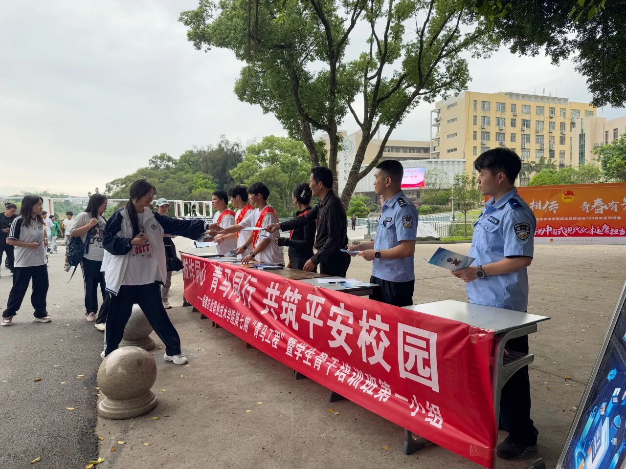 第一小组学员邀请镜洋派出所民警和安保处老师共同在攻关桥开展反诈宣传活动。他们手持宣传单,利用午间人流高峰时段,向师生讲解网络诈骗的常见套路和防范技巧,通过真实案例提醒大家增强安全意识。学员们热情耐心地答疑解惑,将反诈知识融入日常交流,为筑牢校园安全防线贡献力量。