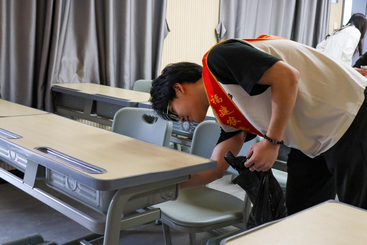 第五小组深入教学一号楼,开展教室清洁行动。学员们逐个检查课桌抽屉,清理残留的废纸、饮料瓶,整理散乱的粉笔、黑板擦,并将讲台物品归置整齐。细微之处的用心服务,让教室焕然一新,为师生营造了舒心的学习空间。