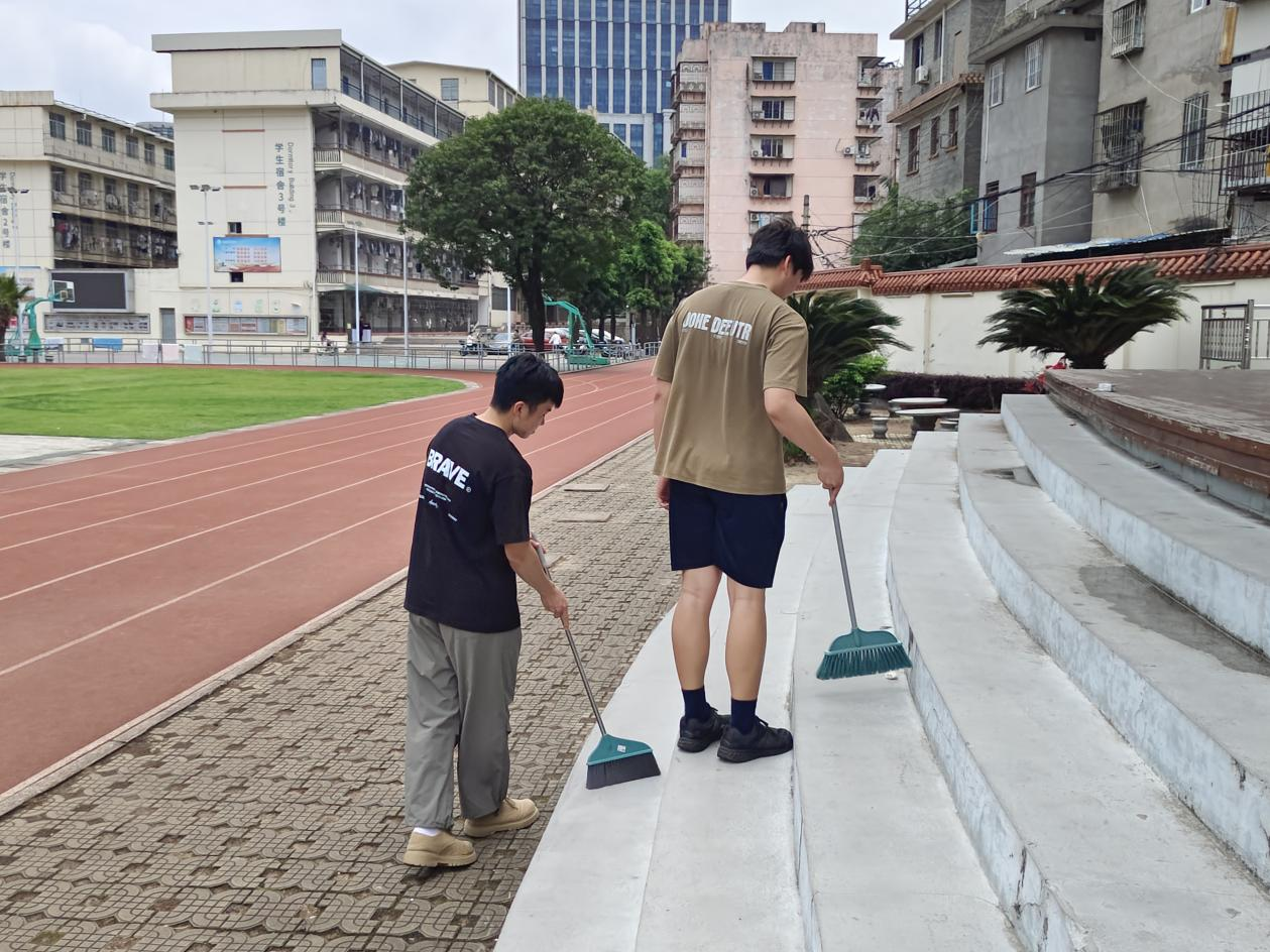首山校区的青马学员自发组成第六小组,对校区操场展开全面清扫。他们分组清理跑道上的落叶、草坪中的塑料垃圾,并擦拭健身器材。烈日下,学员们用汗水守护运动场的洁净,展现了跨校区青马人的责任担当。