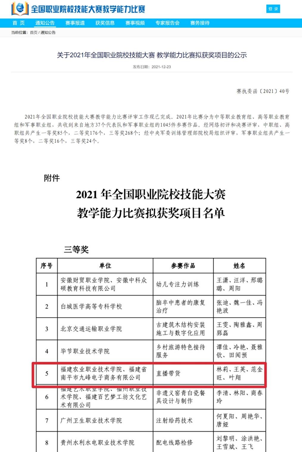 近日,教育部办公厅正式公布了2021年全国职业院校技能大赛教学能力比赛获奖名单。我院林莉、王英、范金旺、叶翔四位老师的参赛作品《直播带货》荣获高职专业课程二组三等奖。