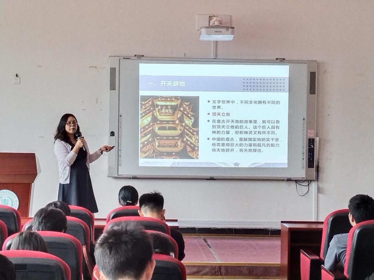 随后郑玉香老师主讲第一场讲座,主题是 “谈天说地”论中华经典,传授国学知识。讲座之初,郑玉香老师以开天辟地、天高地厚、鹏抟九天和神圣天地引申出四个开讲要点,大力弘扬了中华民族优秀传统文化,并结合了盘古开天地的故事和古文字,梳理与天地相关的字词,理解这些字词所承载的文化信息。古往今来,人们常抬头望天、驰骋想象,无论古今人们都在引经据典、热衷用典,用自己的语言文字构建起中华天地间的故事。最后,郑玉香老师向同学们提出如何看待自然世界,感悟天地万事万物之期待等问题,并引导同学们在讲座结束后加以思考。