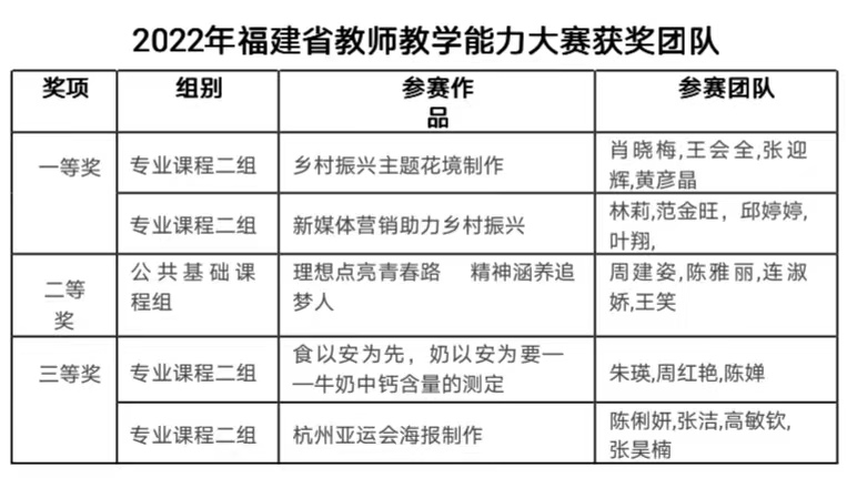 7月25日,福建省教育厅在官网发布《关于2022年福建省职业院校技能大赛教学能力比赛拟获奖名单的公示》,我校斩获2个一等奖、1个二等奖和2个三等奖。