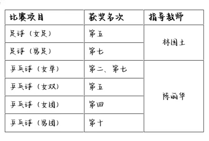 7月1日-8日、7月14日-22日,男女足比赛在福建船政交通职业学院举行,我校足球代表队获得女子足球第五名,男子足球第七名的好成绩。7月16日-22日,乒乓球比赛在泉州师范学院举行,我校乒乓球代表队获得女子单打第二名、第七名,女子双打第五名,女子团体第四名,男子团体第十名的好成绩。