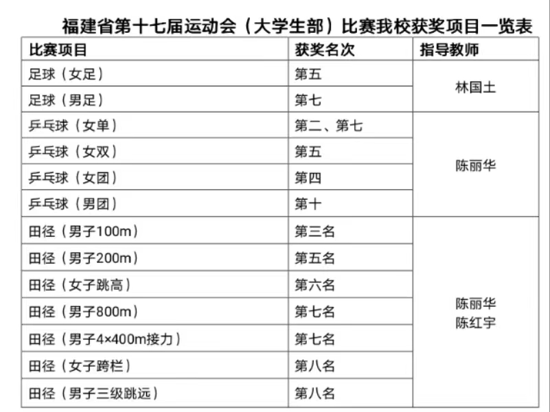 2022年福建省第十七届运动会,是由福建省人民政府主办,福建省教育厅、福建省体育局承办的省级综合性运动会赛事。我校代表队参加了大学生部田径、足球、篮球、羽毛球、乒乓球等项目的比赛,目前已全部完赛。经过全体教练员的悉心指导和队员们的奋勇拼搏,我校代表队在乒乓球、足球、田径项目中获得佳绩,有2人次达到国家田径二级运动员水平。