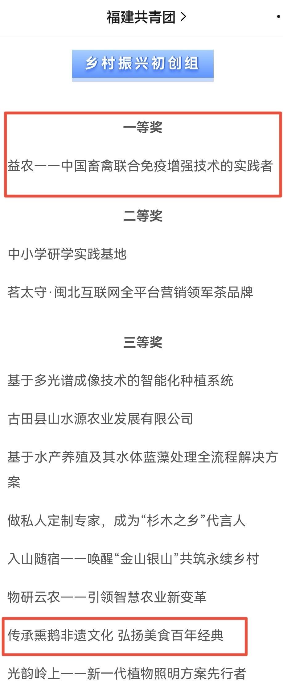 近日,2022年“青春喜迎二十大 创新创业赢未来”第九届“创青春”福建省青年创新创业大赛暨福建省第四届返乡大学生创新创业大赛落下帷幕。经过激烈角逐,我院学子在全省1902个创业项目中脱颖而出,刘毅发团队《益农——中国畜禽联合免疫增强技术的实践者》获得乡村振兴初创组一等奖;祝亲亲团队《传承熏鹅非遗文化 弘扬美食百年经典》获得乡村振兴初创组三等奖。