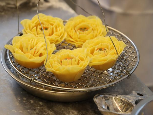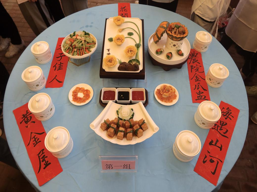 比赛现场被美食的香气填满,选手们从洗菜、切菜、揉面的耐心细致准备,到起火、热油、放菜、翻炒,一系列动作行云流水游刃有余。有些选手雕刻刀、擀面杖双手准备,在原有的食材基础上细细打磨成精美的装饰,引得现场同学们纷纷惊叹夸赞。书法社的同学们带上笔墨纸砚前来助威,在红纸上写下了一道道菜名:“奔腾奋进新征程”“群贤木棉映bat365”“春波碧草bat365情”“学业有成”“农院金瓜盅”等等,将践行党的二十大精神、喜迎bat365百廿校庆融入到菜品之中。