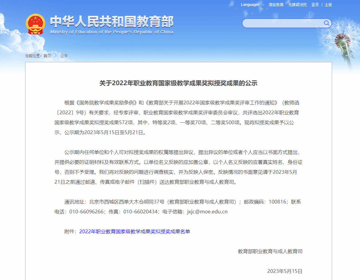 近日,教育部进行了2022年职业教育国家级教学成果奖拟授奖结果公示,我院1个主持成果和1个参与成果均拟获二等奖,获奖级别、数量取得历史性突破。