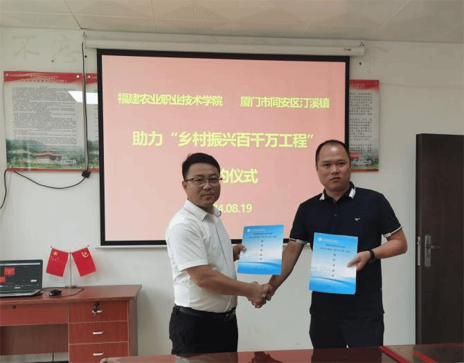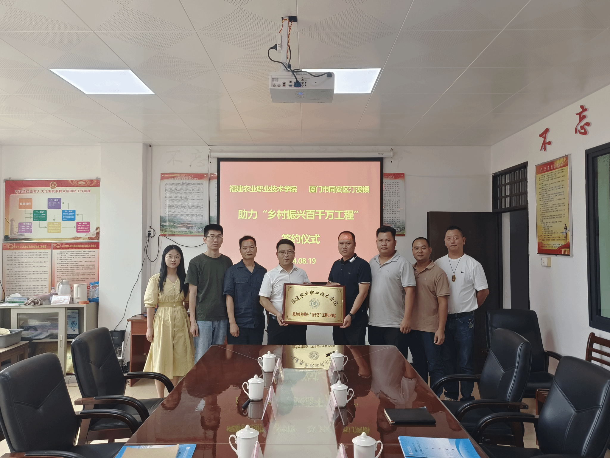 8月19日,我院与厦门市同安区汀溪镇乡村振兴“百千万工程”协议签订暨授牌仪式在汀溪镇荏畲村委会举行。园艺园林学院院长王会全、副院长张盛旺和教师吴成建、黄雪盈,汀溪镇党委组织委员陈小鹏、荏畲村党总支书记陈志伟和总支副书记陈永乐、村委陈少清等有关负责人出席了仪式。仪式由荏畲村党总支书记陈志伟主持。