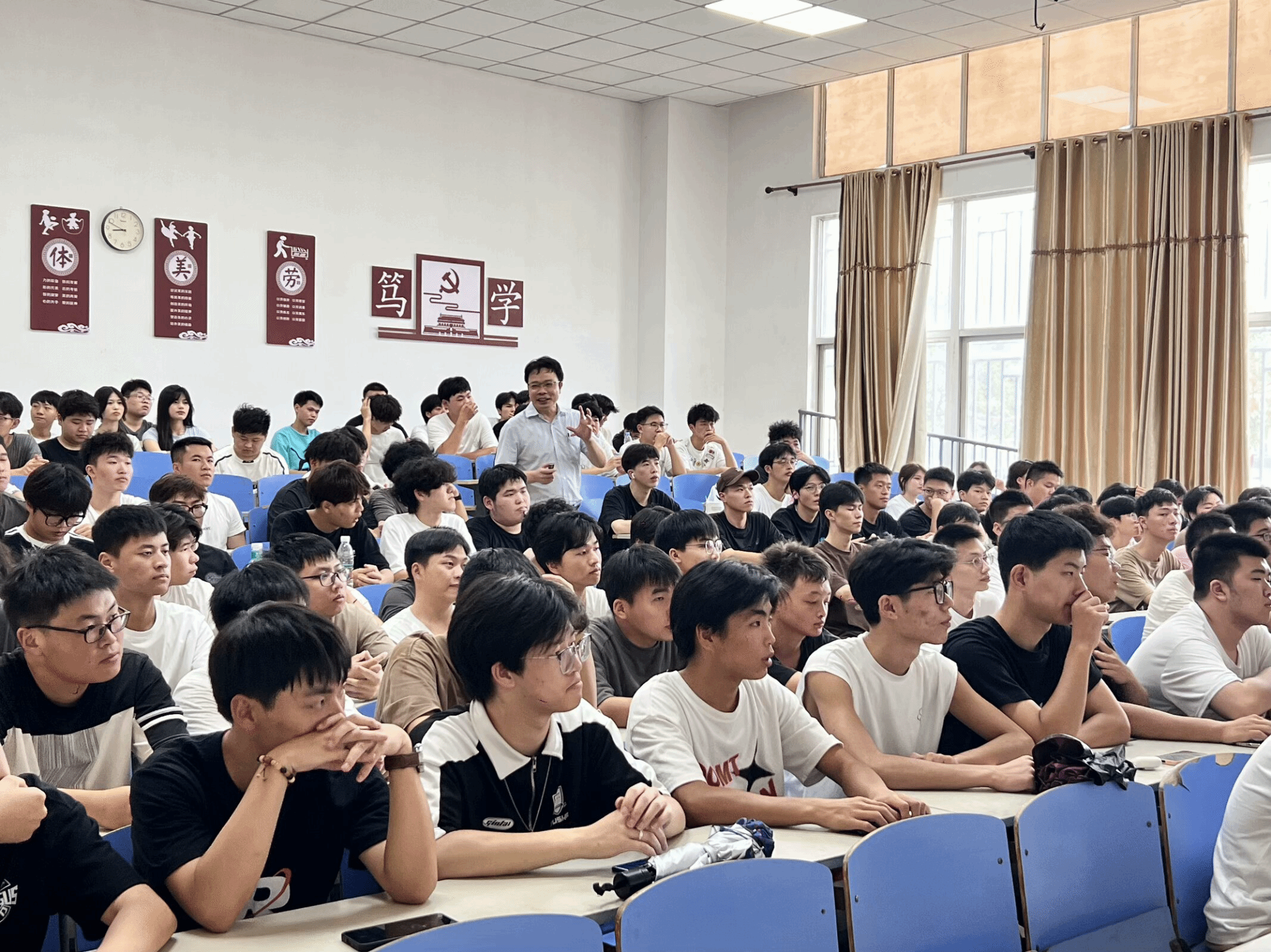 9月10日,主题班会课上,新生们初次相聚,专职辅导员们为新生讲授入学第一课,详细介绍学校规章制度、资助政策等内容。在助导的引导下,同学们开展自我介绍,并积极参与临时负责人竞选,气氛轻松而热烈。大家分享着自己的兴趣爱好、梦想与期待,迅速拉近了彼此之间的距离。