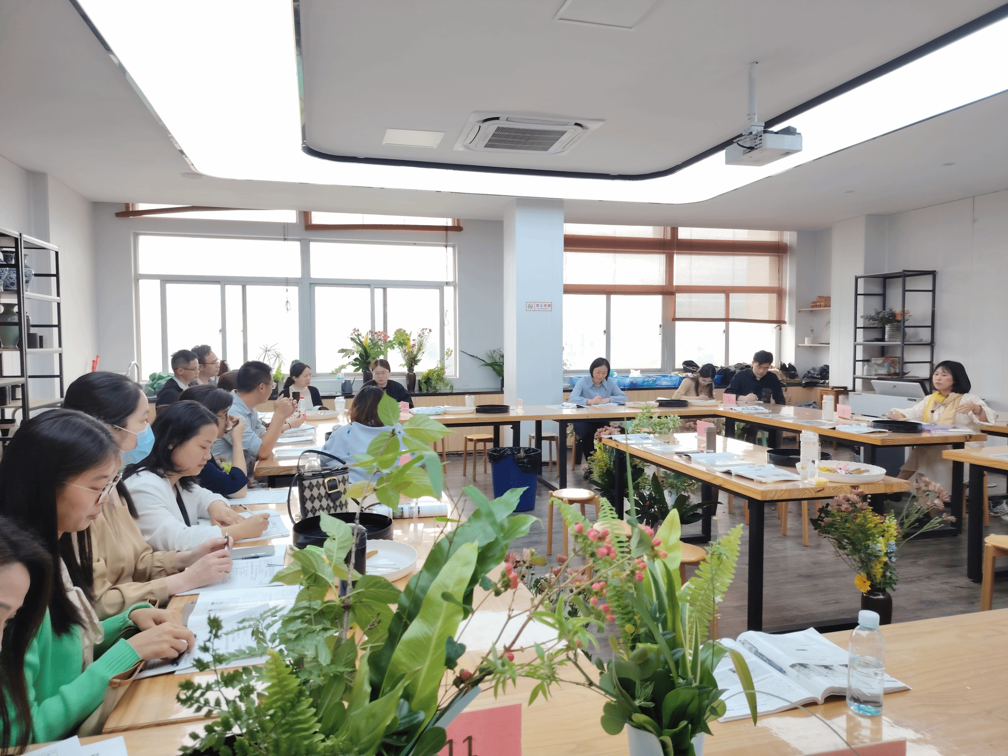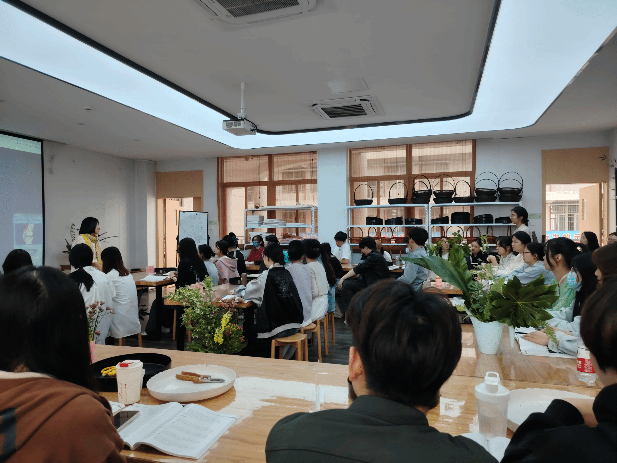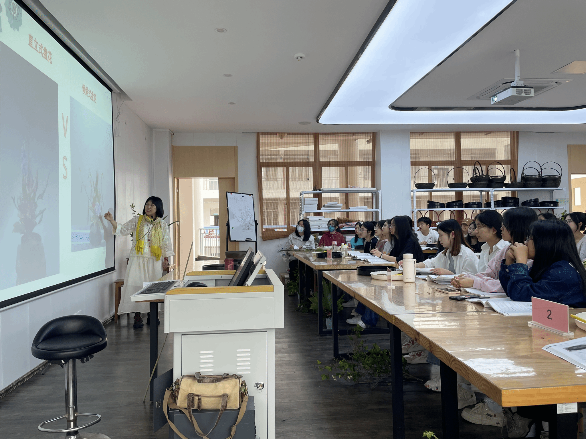 在讲解过程中,肖老师不仅传授了理论知识,还亲自演示了插花过程,将理论与实践相结合,使学生能够直观地理解插花艺术的精髓。她生动形象的讲课方式和对插花艺术的深刻理解,赢得了在场师生的一致好评。