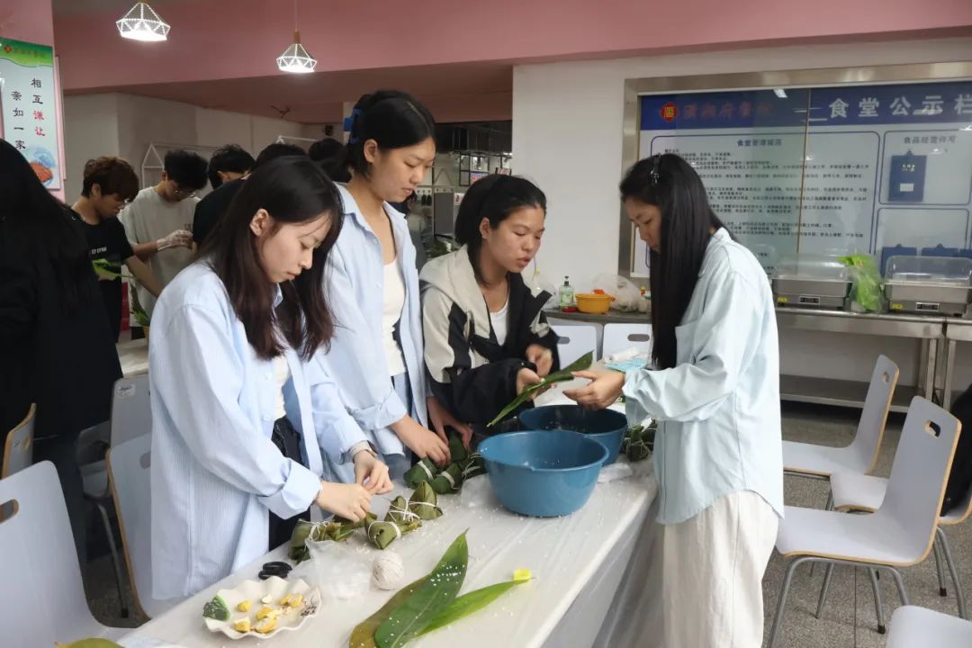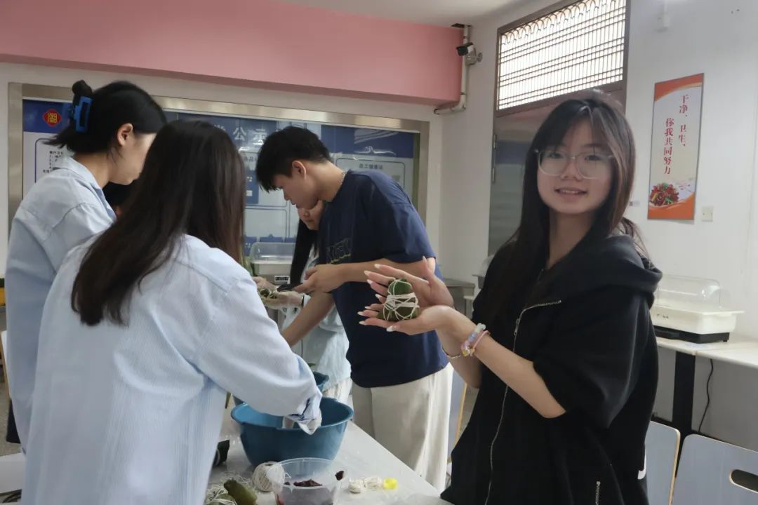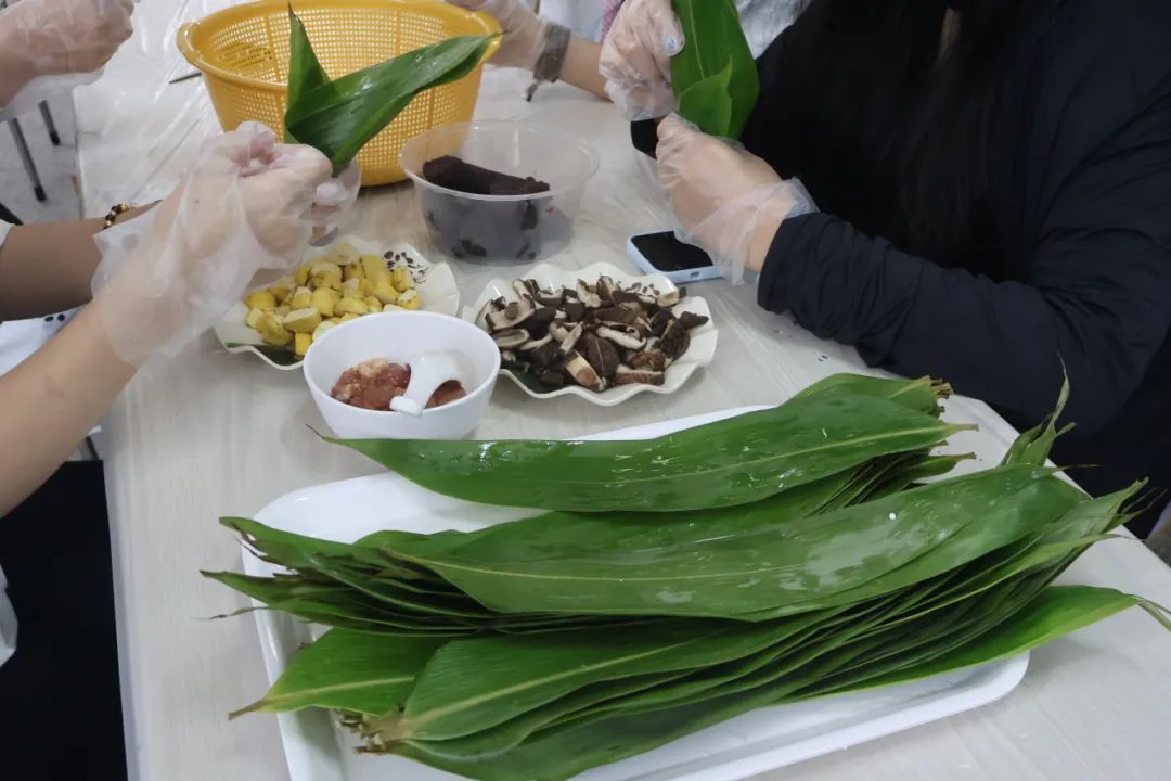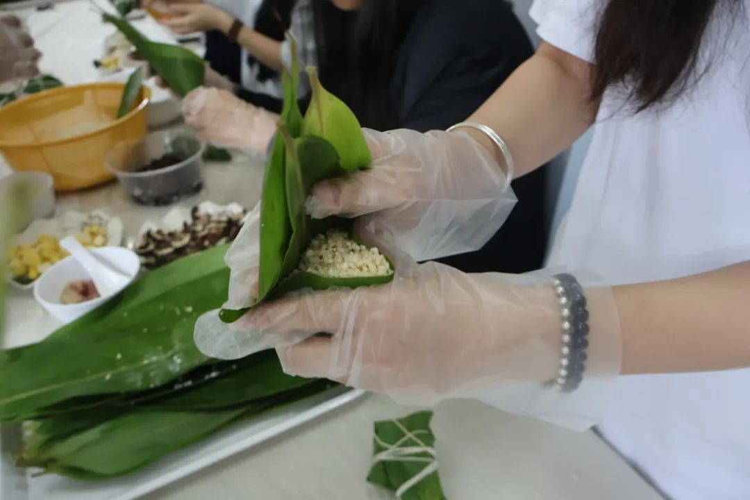 活动伊始,工作人员悉心讲解、耐心指导。同学们兴致勃勃地开始包粽子,先铺上翠绿粽叶,再填入糯米,放入粽馅,最后扎紧线绳。起初,大家手法生疏,包出的粽子形态各异。有的松散得好似要“散架”,有的紧实得宛如小石块。但同学们相互帮助、彼此交流,渐渐掌握了诀窍。