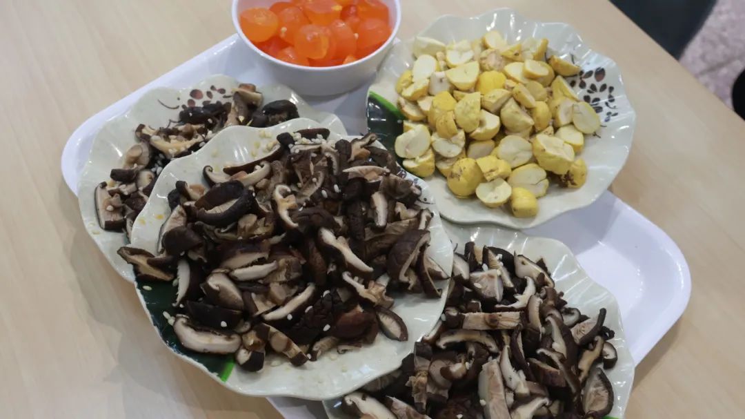 粽叶的清香弥漫在空气中,桌面上分类摆放着糯米、咸蛋黄、香菇、板栗等食材,等待着同学们的巧手制作。