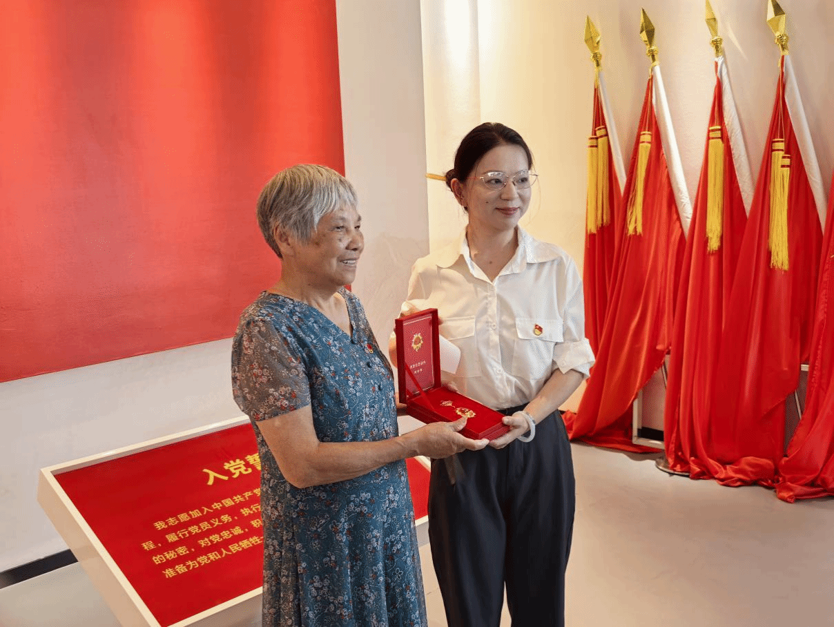 麦园社区居民委员会主任曹薇为老党员颁发“光荣在党50年”纪念章