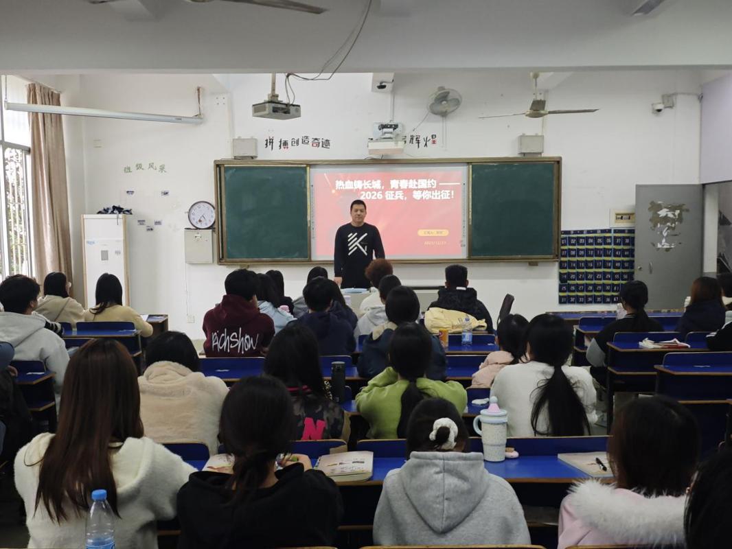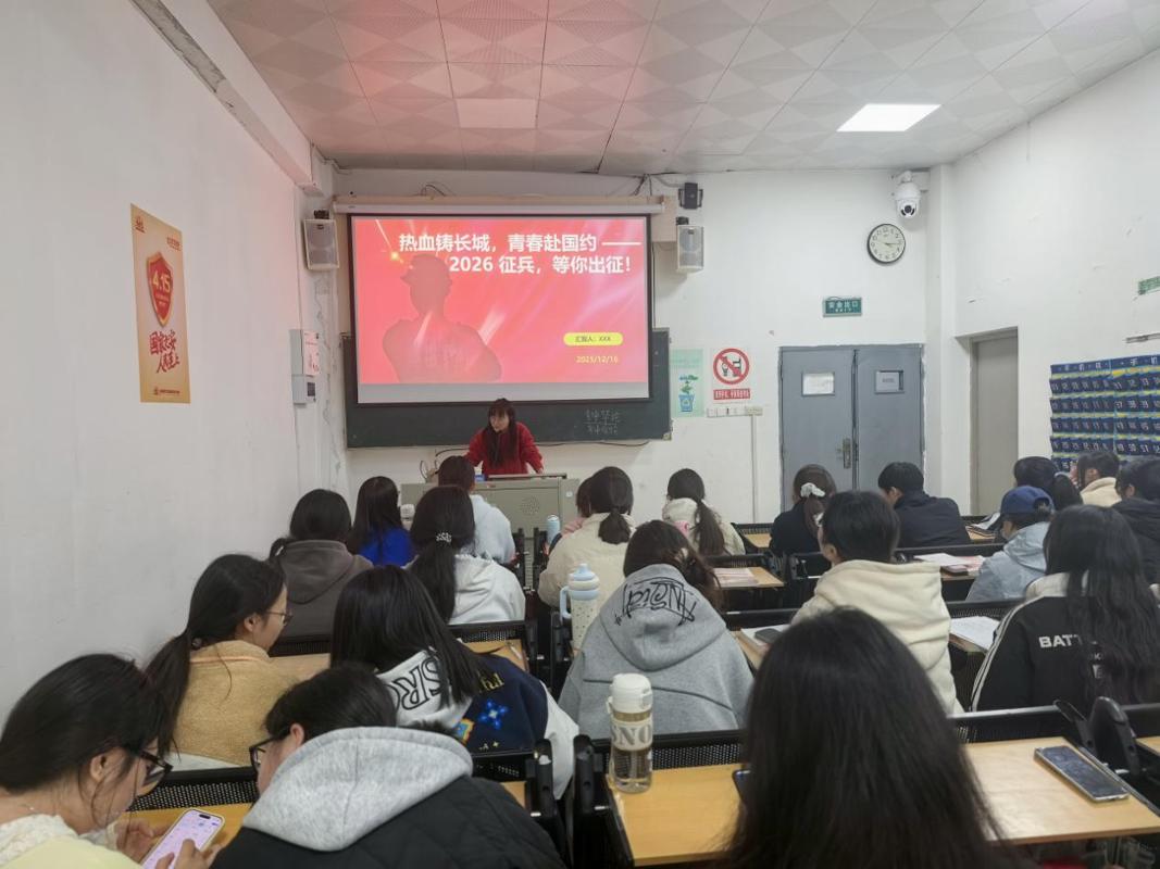 班会现场,各班辅导员聚焦征兵核心政策展开全面解读,针对应征年龄、身体条件、政治审查、视力标准、体测项目等基础要求逐条进行说明,确保同学们入伍基本门槛有深入了解;同时,系统梳理报名时间节点、线上填报流程、材料准备清单等实操要点,重点解读学费补偿代偿、升学优惠等激励政策,让同学们知晓入伍全流程及相关政策保障。