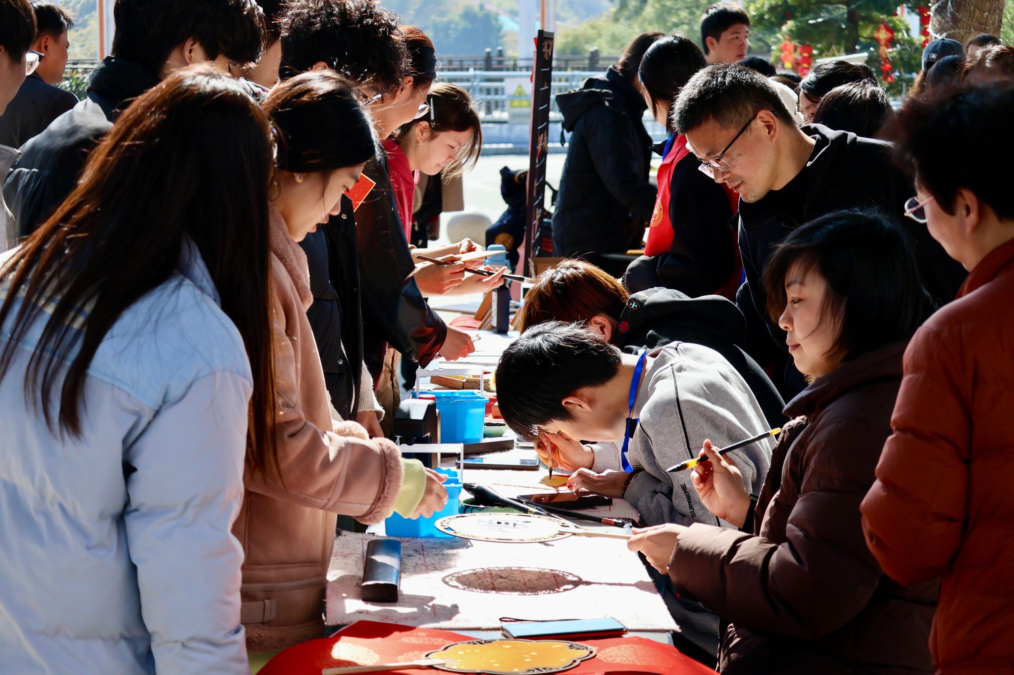 本次活动内容丰富,涵盖宋锦书法摆台制作、春联与福字书写、书法扇创作等特色环节。现场墨香萦绕,红纸翻飞,师生们或挥毫泼墨书写新春祝福,或专注构思创作文创作品,在笔墨流转间感受传统艺术魅力,现场洋溢着浓厚的节日氛围。