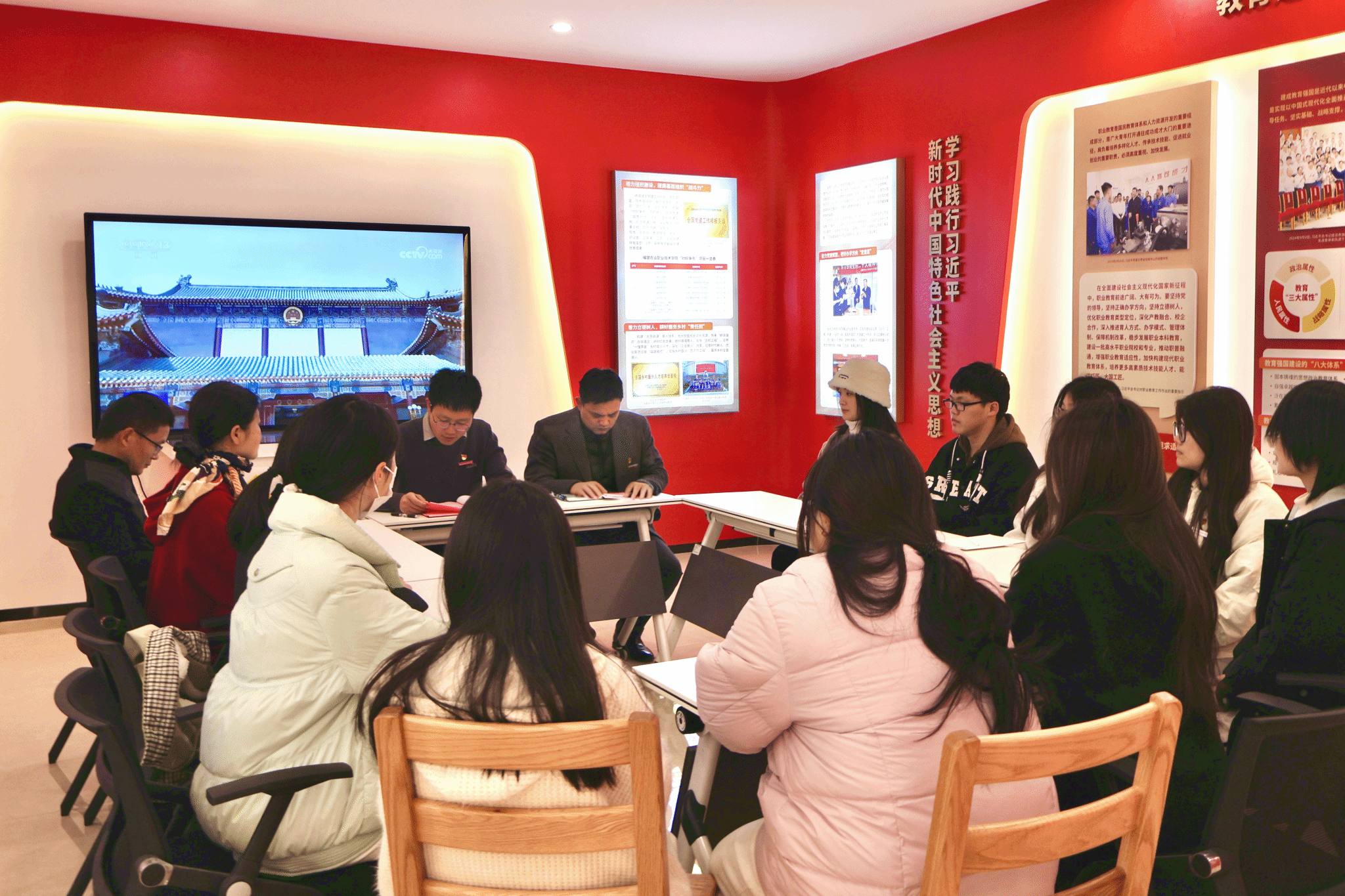随后,学生党支部书记黄琳翔带领全体人员集中学习了习近平总书记2026年的新年贺词及在中央农村工作会议上关于“三农”工作的重要指示精神。大家还通过展馆数字模块观看了习近平新时代中国特色社会主义思想专题学习视频。