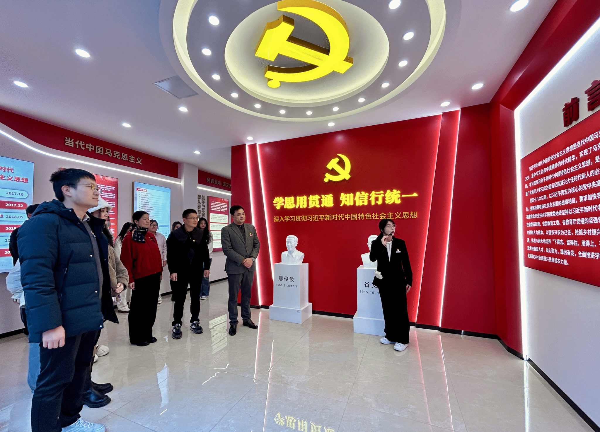 本次活动由学生预备党员肖玥琪担任讲解员。通过细致讲解与实地感悟,大家深入学习贯彻习近平新时代中国特色社会主义思想,深刻领会习近平总书记关于教育、“三农”工作及职业教育的重要论述,系统回顾了校党委始终以党的创新理论为指导,坚守立德树人根本任务、勇担强农兴农使命的发展历程,深切感受红色基因在校园中的传承脉络。