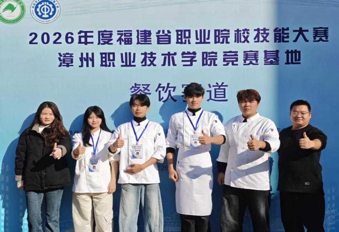 同期,餐饮赛道(高职组)在漳州职业技术学院开赛,全省11所高职院校15支队伍展开比拼。我院两支参赛队伍默契协作、各展所长:王苏峰、梁赛赛老师指导的陈国润、吴宗伟、林陶喆、陈紫彤团队,将传统技艺与现代创新理念融合,荣获银奖;梁赛赛、蔡晨光老师带领的吴宏斌、黄智楠、苏文文、程伟团队,以规范操作与品质追求赢得评委认可,斩获铜奖。
