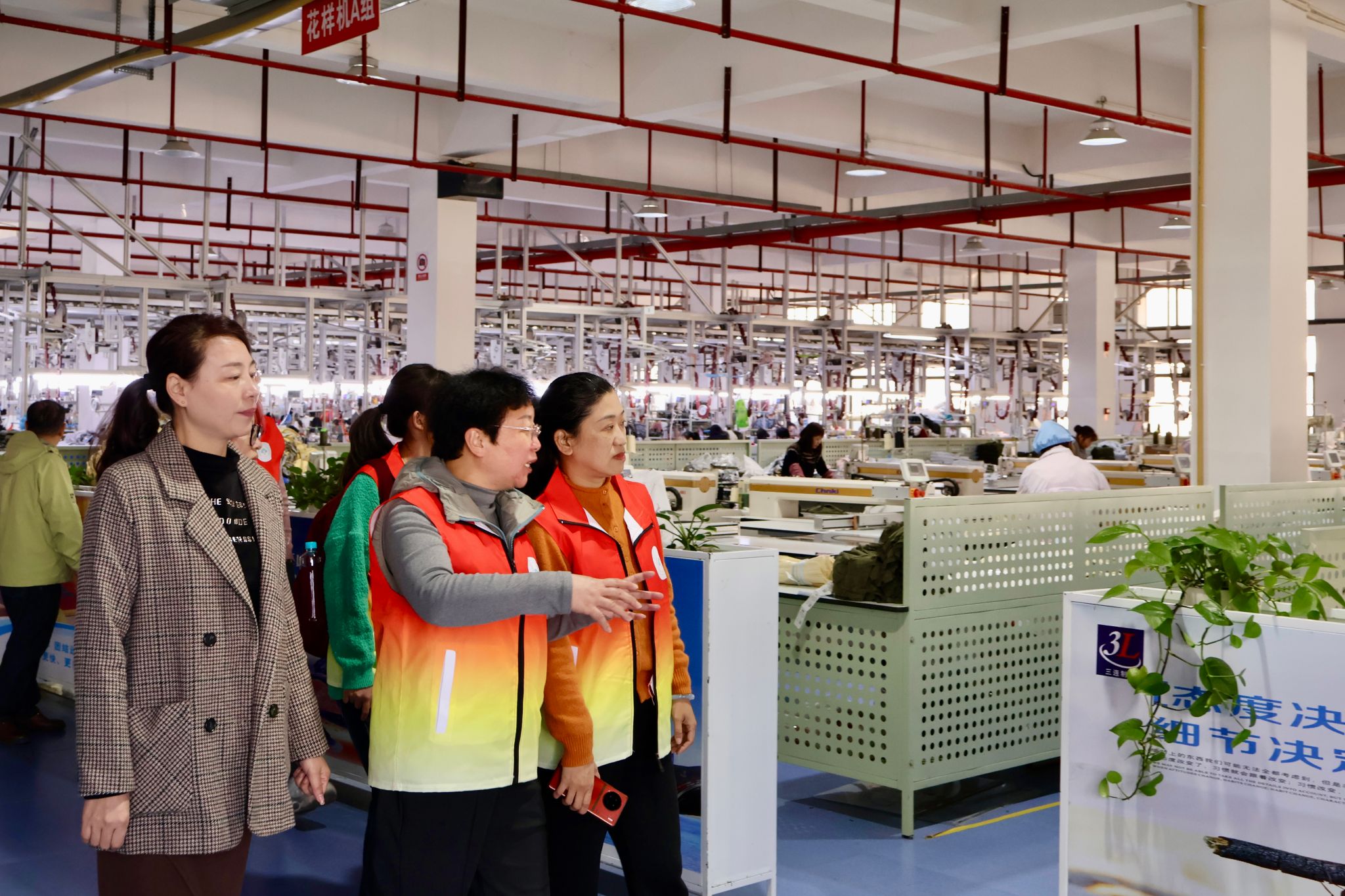 在刘经理的带领下,团队成员沿生产线先后参观仓储、裁剪、模板、缝制、后整等核心车间。从智能仓储系统的高效调度,到自动化裁剪的精准作业;从模板工艺的细致呈现,到智能吊挂流水线的有序协作,一系列现代化生产场景使团队成员直观感受到服装设计、工艺与生产管理的系统性,对智能制造在传统产业的落地应用形成具象认知。