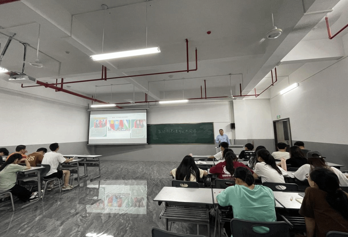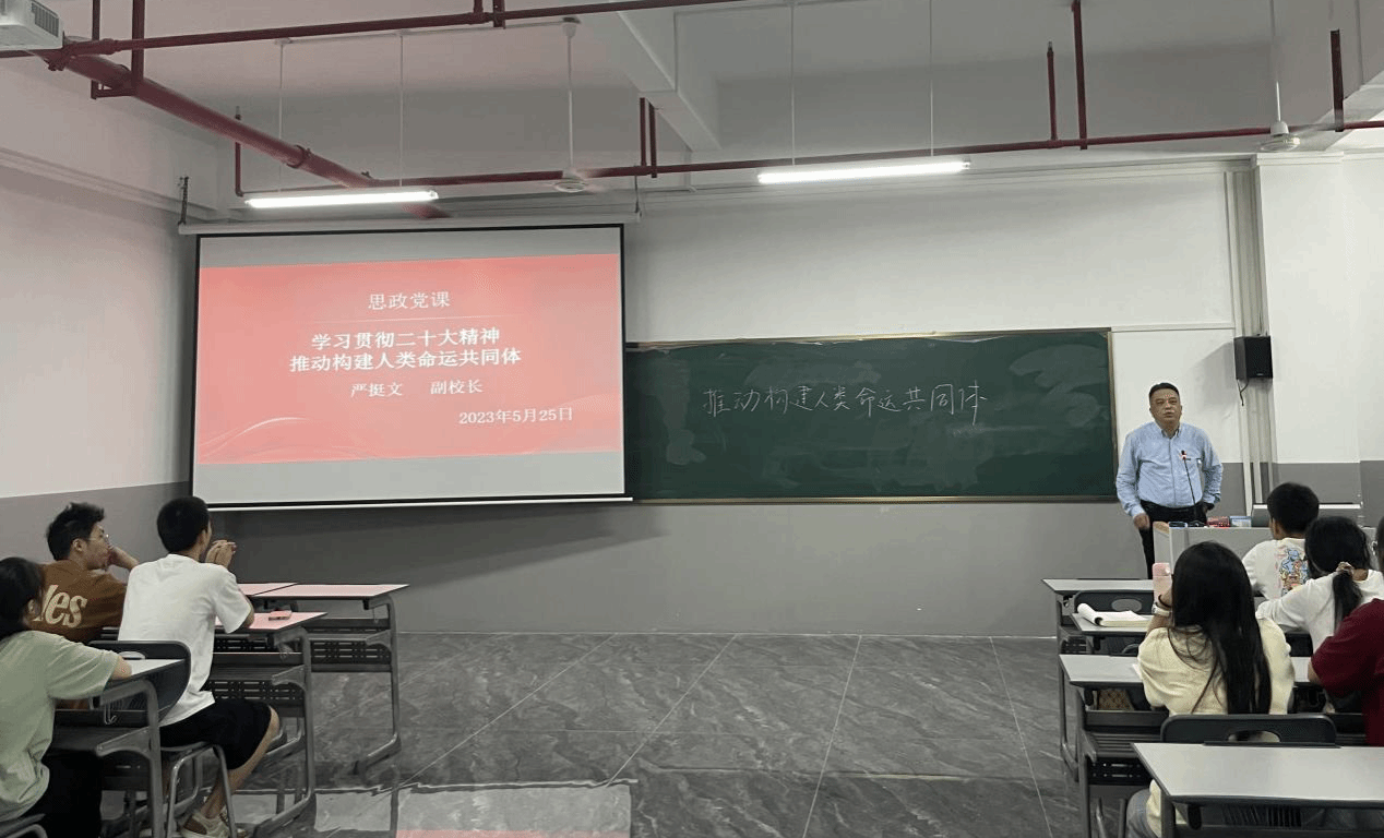 5月25日下午,学院党委委员、副院长严挺文在五食堂503教室为2022级食品智能加工技术专业学生讲授“推动构建人类命运共同体”专题思政课。