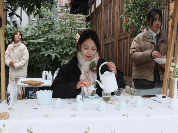 园艺园林学院的同学们分布在"非遗"吉市集与花市集,吉市集“茗茶有约”以闻香茉莉、寻味茉莉、宋韵点茶为主题,传承、创新、一盏茶的千年风雅气韵为载体,花市集“花开有声”以传统与现代元素交融碰撞,插花作品展览为主题,花艺表演、中国传统插花作品展览、现代花艺作品展览、游客手工花艺作品制作体验等为载体,为过往的游客行人带来精彩的茶艺表演和精湛的花卉工艺。