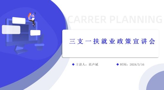 会议伊始,范声斌老师先从什么是“三支一扶”、2024年“三支一扶”计划政策的招募背景、聘用流程、招聘计划、招聘对象、条件、报考流程以及优惠政策等8个方面向同学们讲解了“三支一扶”。而后范声斌强调毕业生要抓住机会,积极投身到基层建设中去,动员大家积极投身于“三支一扶”中。