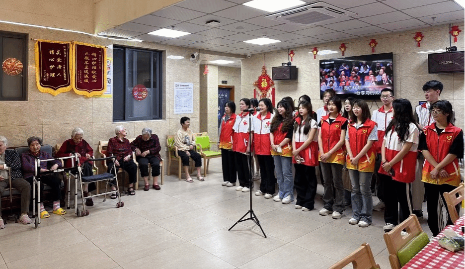 红十字会的志愿者们先与长者们进行了温馨的谈话,了解他们近期的生活状态和健康状况,并陪同她们在院内活动,随后志愿者们为老人们带来了一场丰富多彩文艺表演一句句暖心的话语、一支支优美的歌曲在养老院里交织出了一片幸福祥和的氛围。