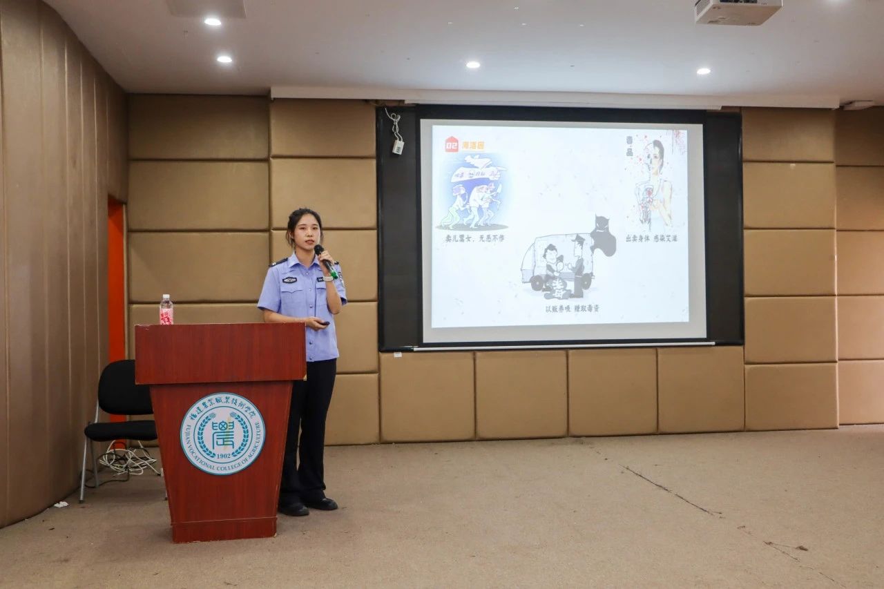活动伊始,禁毒宣讲员陈霞民警通过PPT演讲、视频演示、结合实际案例等方式向同学们讲授禁毒知识,从毒品的性质、种类、特征等方面进行深入浅出地讲解,引导我院师生了解毒品危害、识别毒品方法以及预防毒品侵蚀等知识。整场宣讲活动知识内容丰富、节奏紧凑、角度新颖、催人警醒,不仅加深了师生对禁毒防毒知识的理解,还增强了防毒拒毒意识,号召同学们要乐观面对生活,保持健康的生活方式。