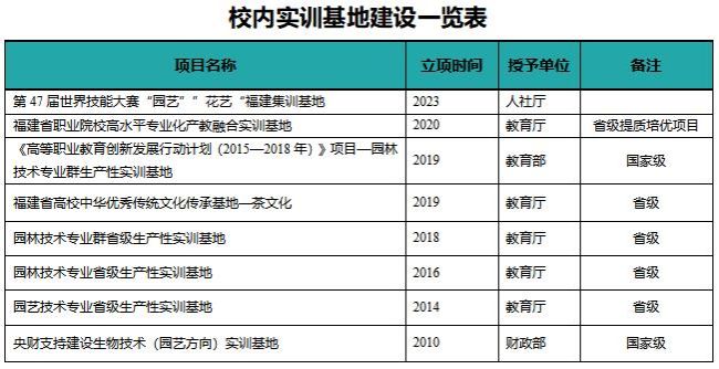 学生的进步离不开成长的沃土。通过加强校内外实训基地建设,深化产教融合,建成40个校内实训基地,其中国家级生产性实训基地2个、省级生产性实训基地3个、省级高水平专业化产教融合实训基地1个、省级“中华传统文化(茶文化)传承基地”1个、第47届世界技能大赛福建集训基地2个;与现有的40多家校外实训基地本着“互惠互利、合作共赢”的原则进行深度、多种形式合作,共同建立完整的校外实训基地实习标准和保障办法,共同开发校企合作实习项目,开发校企合作教材,开展科研项目,共同打造省内高水平专业化产教融合实训基地。