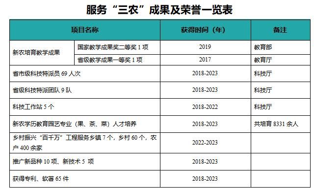 园艺园林学院教师积极投身社会服务,助力乡村振兴,向全省各乡镇派出省市级科技特派员69人次,省级科技特派团队9队,科技工作站5个;乡村振兴“百千万”工程服务乡镇7个,乡村60个,农户400余家;近五年在全省推广新品种10项、新技术5 项,获得专利、软著65件;近五年培训新农学员8331人,面向企业和行业培训4000人次以上。获得国家级教学成果奖二等奖--“中国特色新型职业农民培育“一模式四体系一机制”整体解决方案的创新与实践”(2019年)。