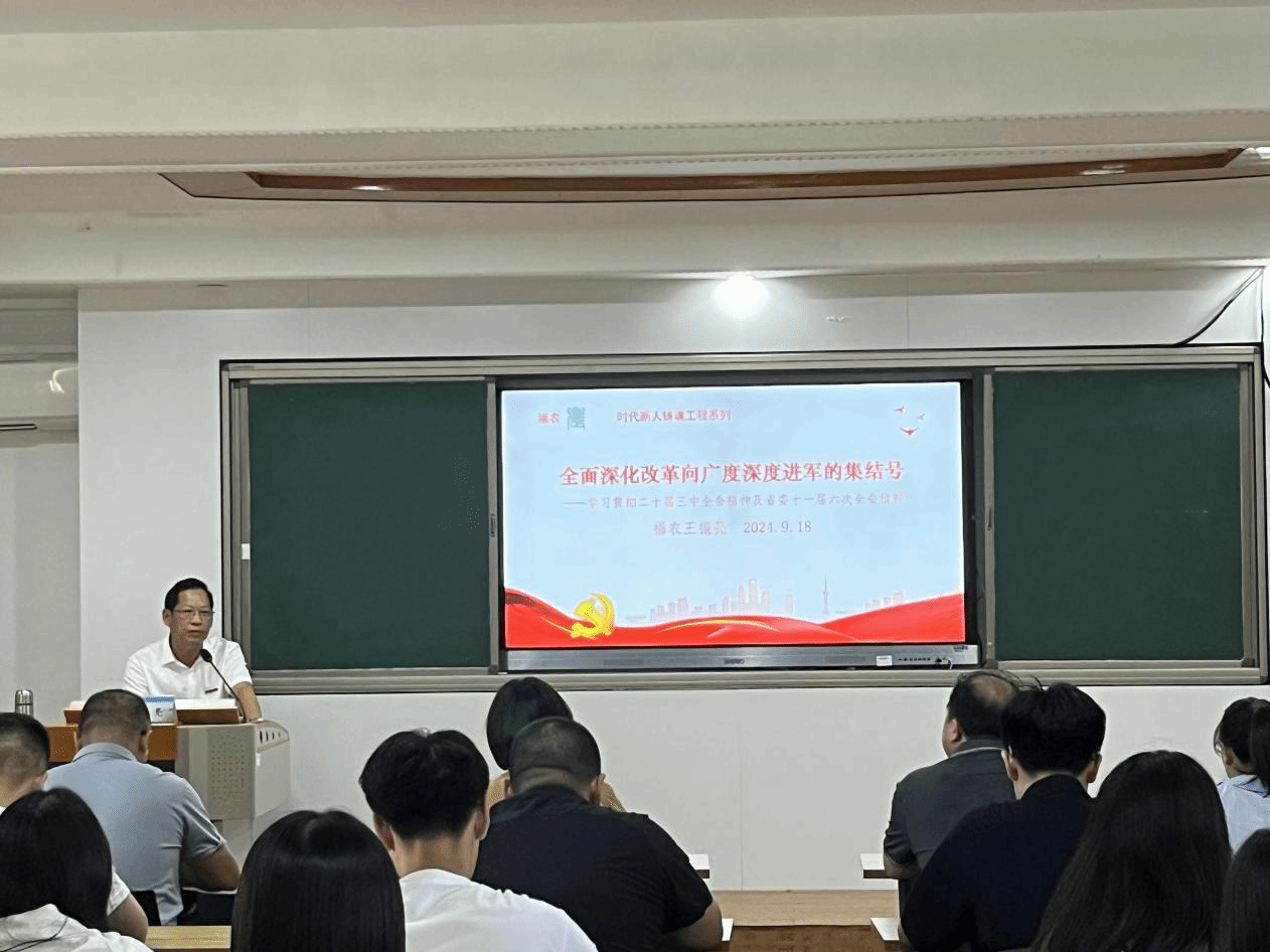 会上,王振亮副书记以《全面深化改革向广度深度进军的集结号》为题,围绕十一届三中全会和十八届三中全会的重大意义、党的二十届三中全会和省委十一届六次全会的主要精神以及求真务实敢做善为深化教育教学改革等三个方面对党的二十届三中全会精神进行了深入阐述和系统解读。