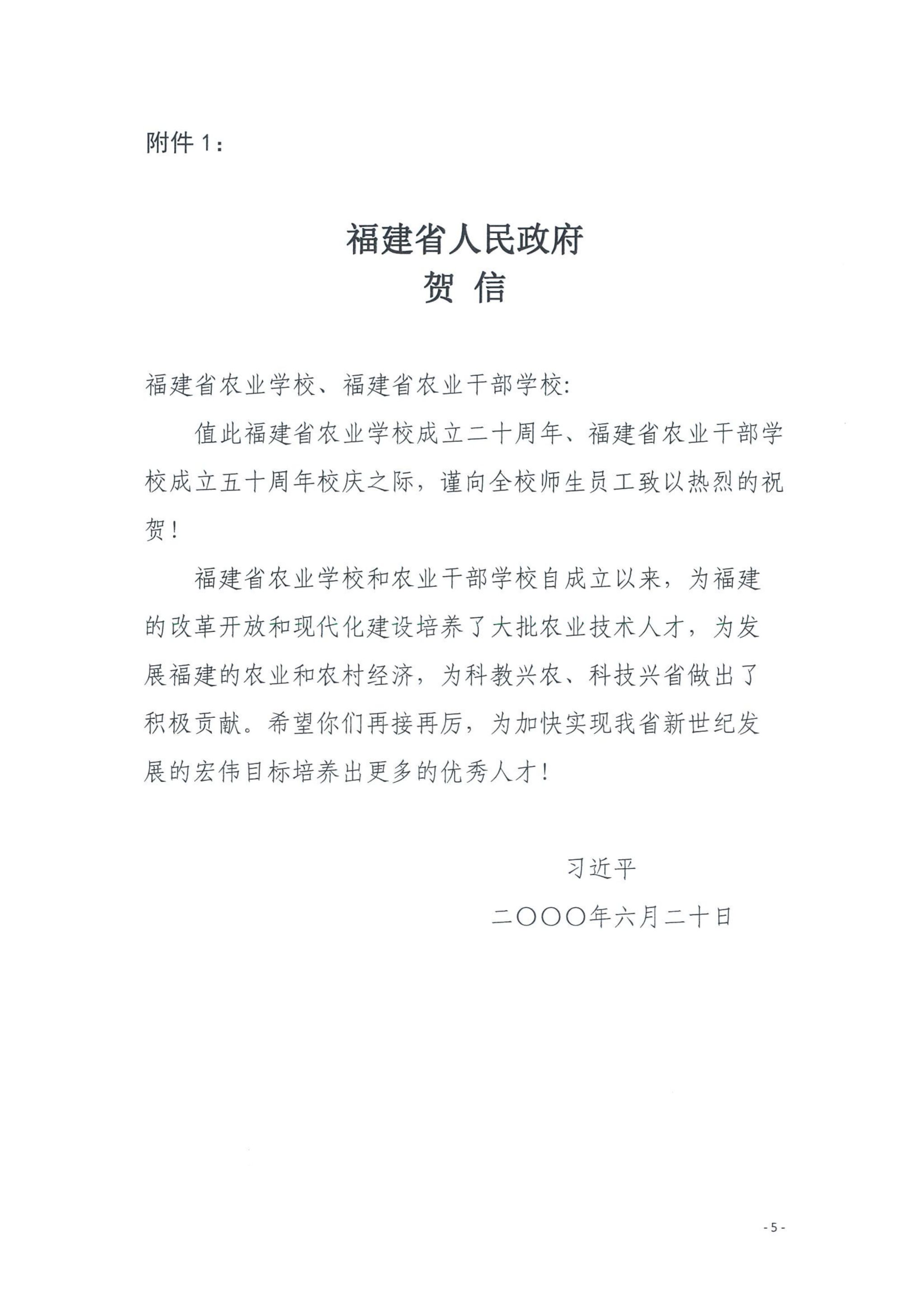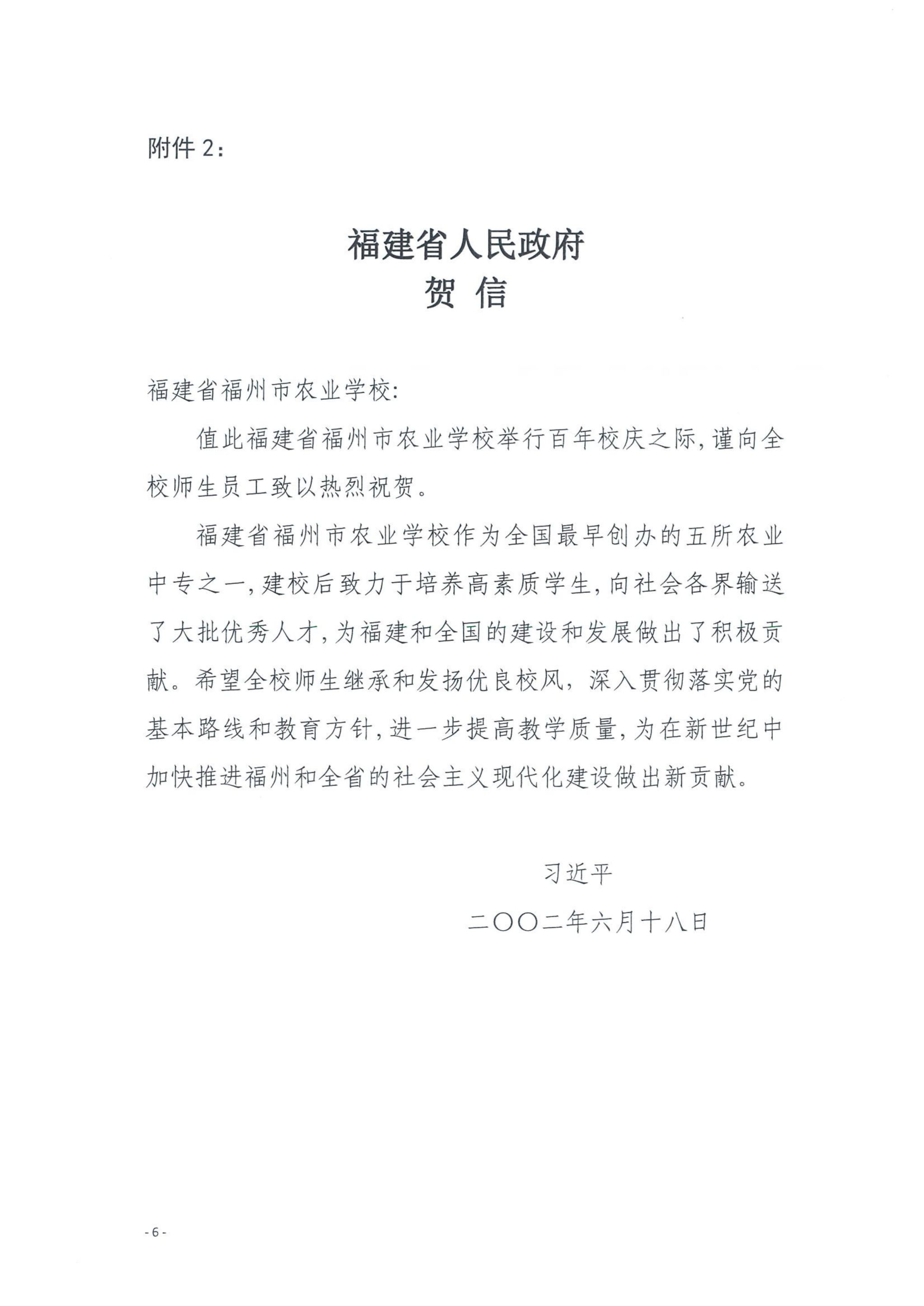 2000年、2002年,时任福建省省长的习近平同志先后给bat365在线登录网站注册赠送36前身(福建省福州市农业学校、福建省农业学校、福建省农业干部学校)发来校庆贺信,激励和鞭策一代又一代bat365人踔厉奋发、砥砺前行,夺取一个又一个胜利。