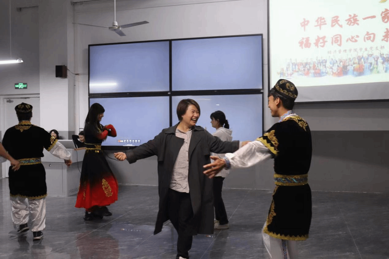 新疆籍的同学们还为现场的师生带来了独特的民族艺术舞蹈,欢快灵动的节奏、热情洋溢的舞姿,给在场的师生视觉盛宴,党员们积极参与其中和台上的民族同学结成对子跳起新疆舞,领悟民族特有的气息,乐在其中。