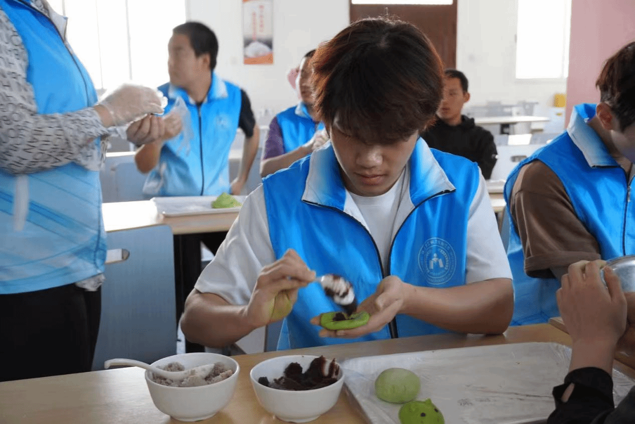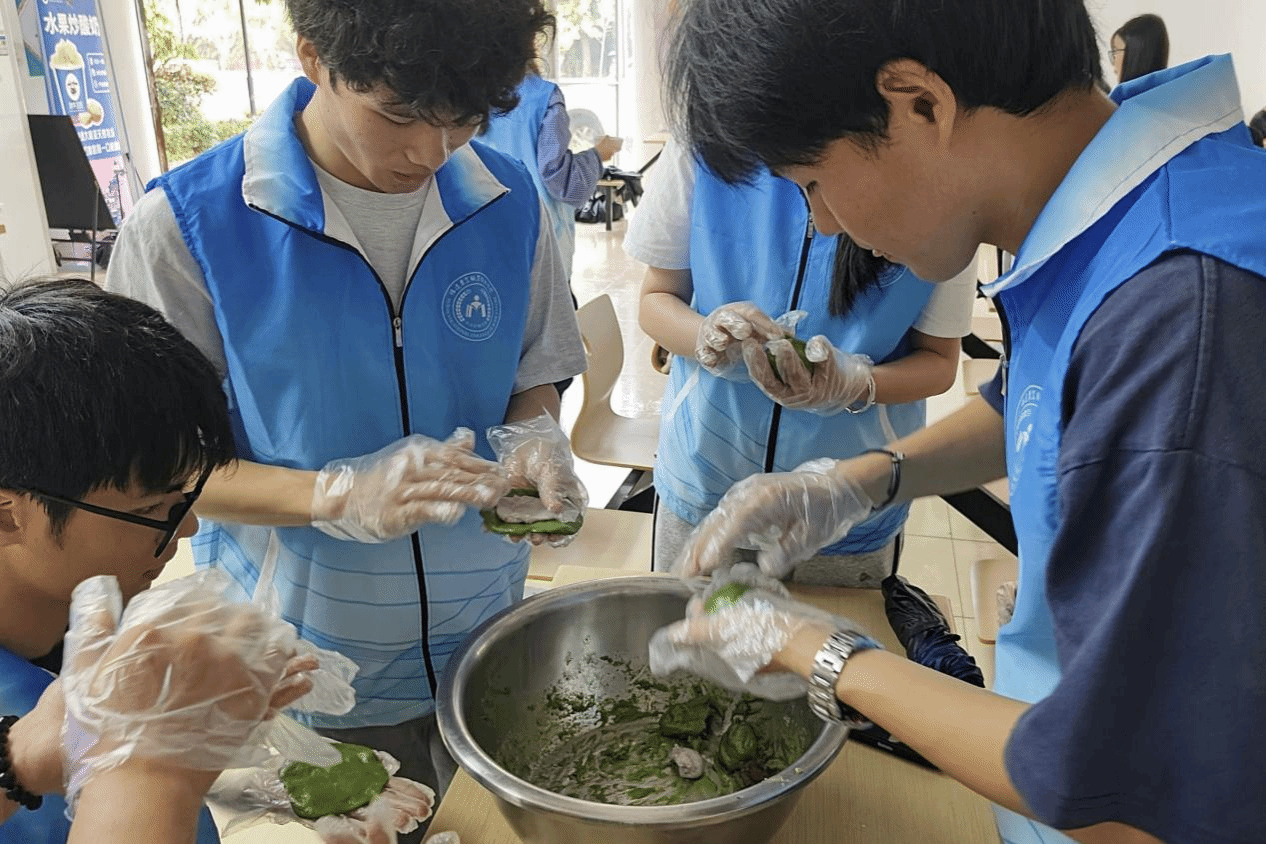 在实践制作环节,学生志愿者们相聚食堂内,分组协作,揉面包馅蒸制,沉浸式体验手工制作的乐趣。活动现场欢声笑语不断,一个个碧绿莹润的青团逐渐摆满桌面,清香四溢