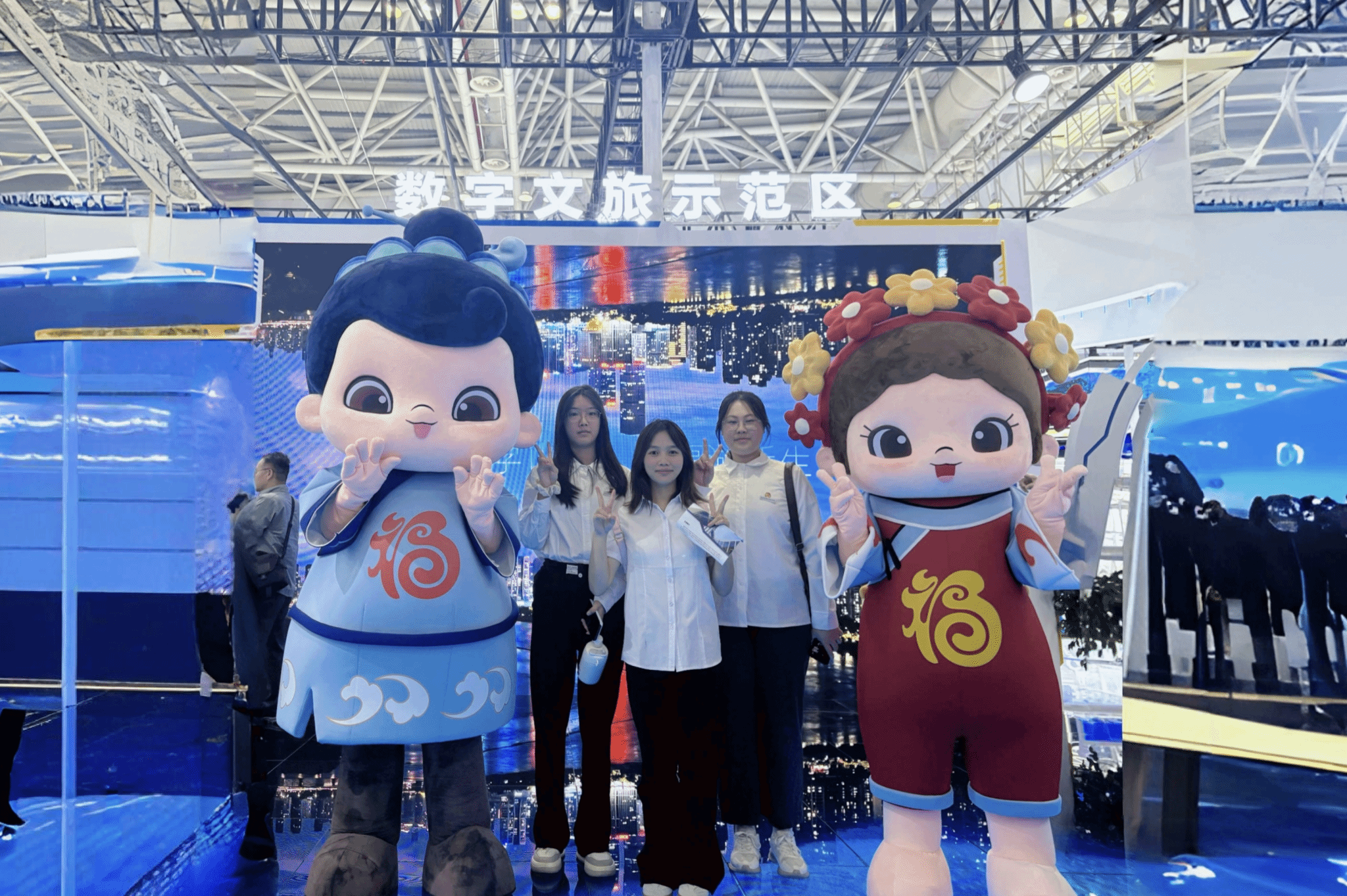 峰会现场,青马学员和学生骨干穿梭于各个展区之间,重点参观了低空经济、人工智能、数字文旅、智慧城市等主题展区。低空经济展区,应急救援飞行器、载人无人机、物流配送无人机等设备引发学生浓厚的兴趣,技术人员现场讲解了无人机在智慧城市管理中的创新应用场景。在人工智能专区,学生近距离了解AI医疗诊断系统、体验AI伴你云游景区、观看AI书法机器人挥毫泼墨,充分认识到AI正以“好用”为导向,重塑千行百业的生产力范式。许多同学围着“AI伴你云游景区”,戴上VR眼镜沉浸式体验文旅交互新模式,并与福建“福”文化形象IP“福宝”一同合影。