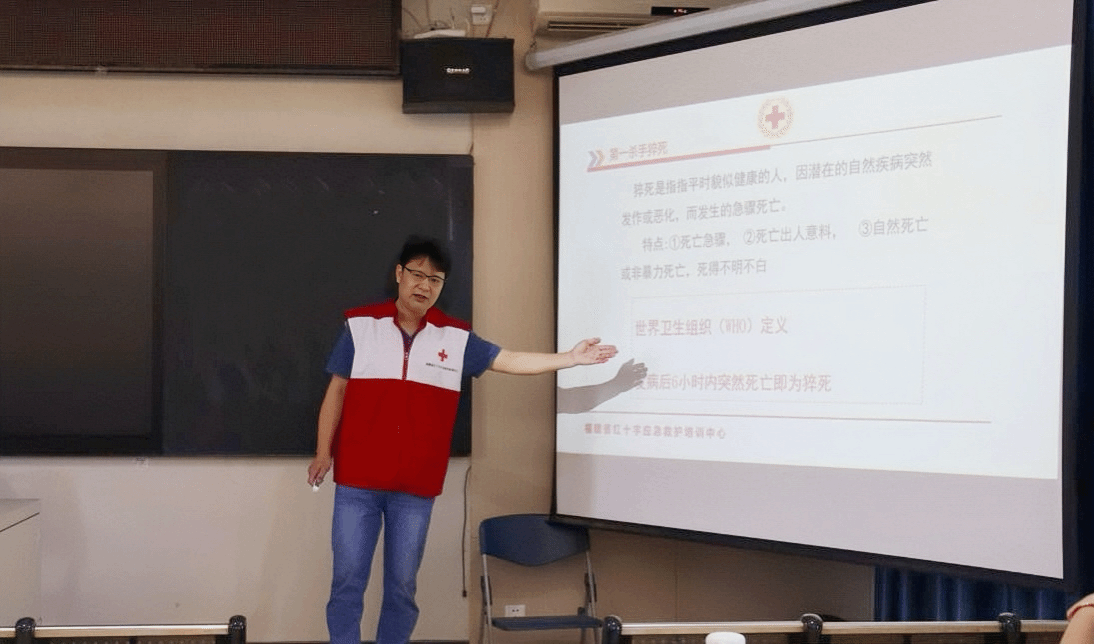 省红十字会培训导师通过视频案例,讲解急救重要性及基本原则,强调了“黄金四分钟”的重要性。在成人心肺复苏教学环节,导师分步骤演示从判断意识、呼吸到胸外按压、开放气道、人工呼吸的操作流程。学员以2人一组交替练习,导师逐一纠正按压深度、频率等操作细节。