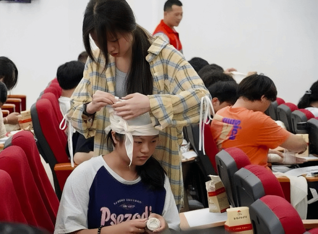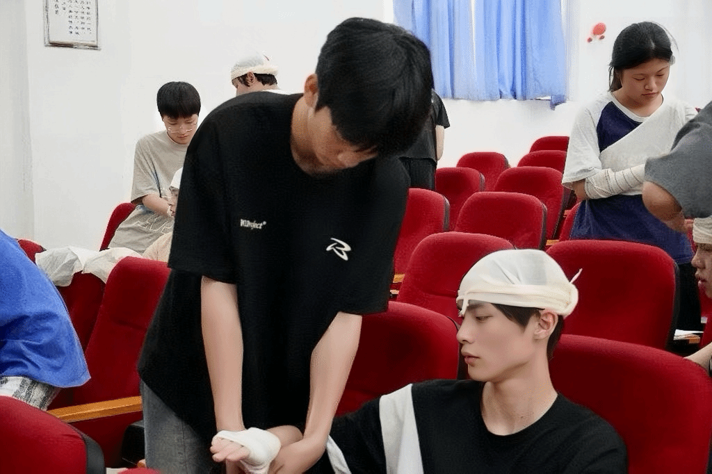 实操环节,导师结合交通事故、运动损伤等常见场景,教导学员模拟如何做好伤员止血、包扎、固定、搬运,提醒避免二次伤害的关键要点。学员们在角色转换中认真练习环形包扎、螺旋反折包扎、8字包扎等多种技法,针对头部、手臂、关节等部位进行模拟演练。导师在旁指导,时刻提醒学员们要注重操作规范,展现出守护生命的责任感。
