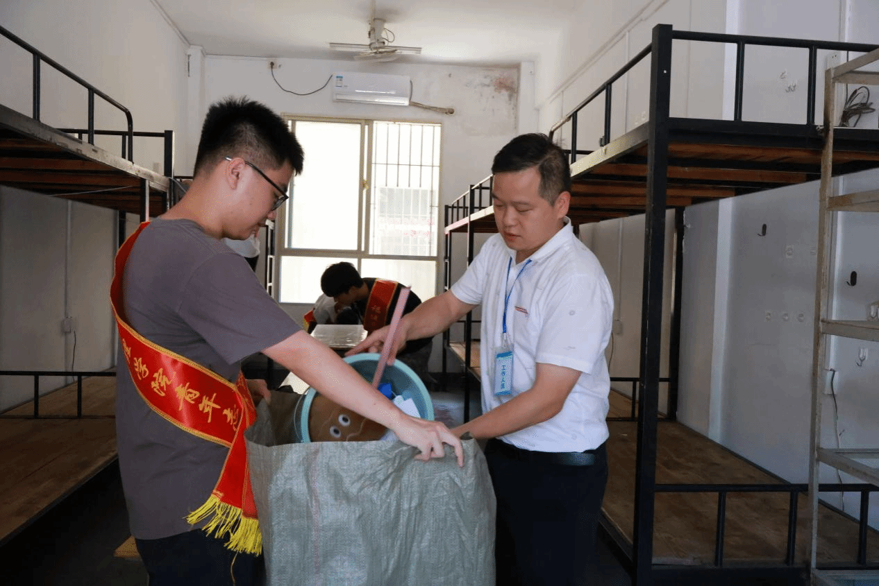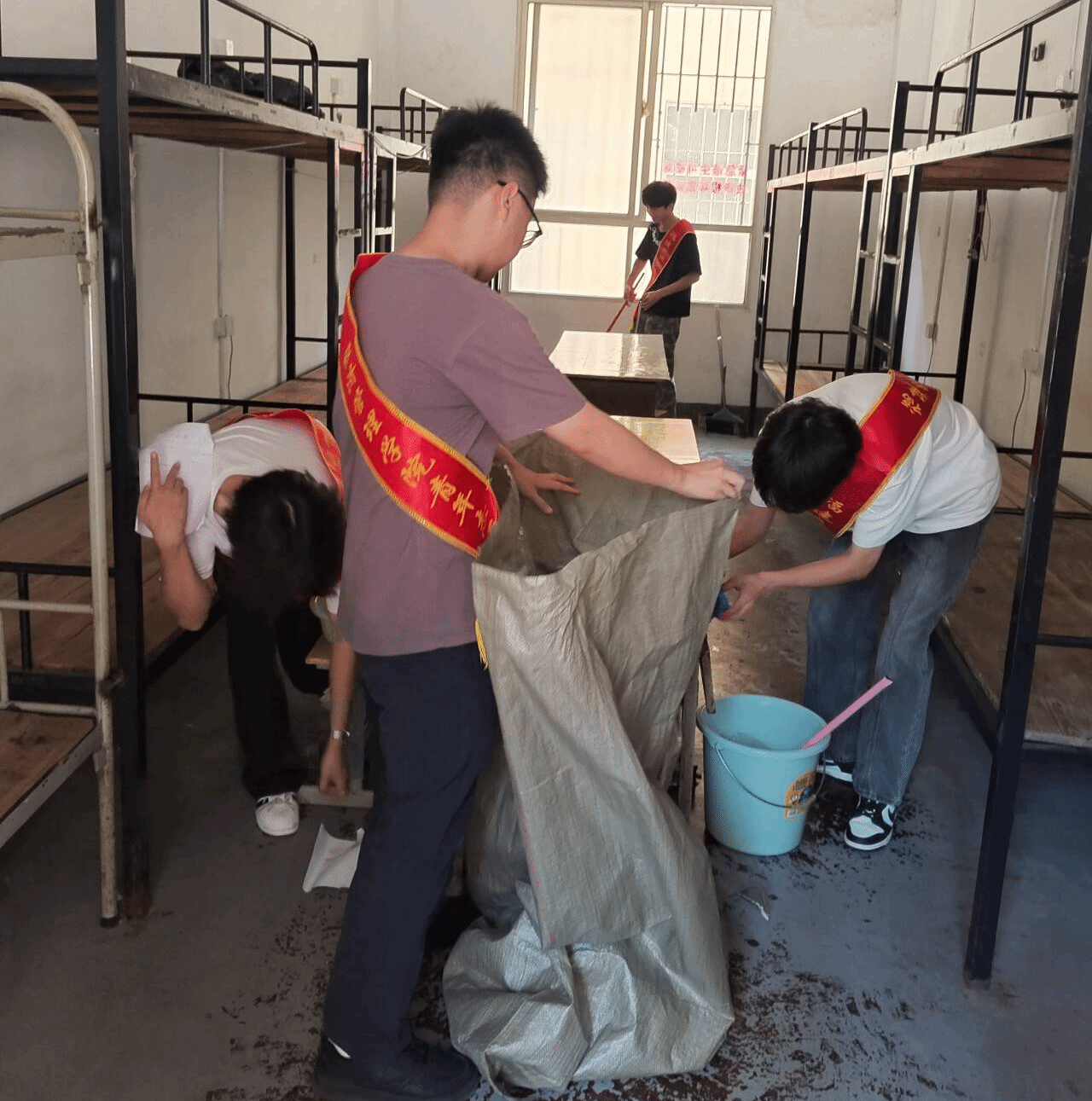 学生党员们热情高涨,分工明确,成立“物资整理组”“卫生清洁组”二个小组。物资整理组深入学生宿舍,协助23级即将离校实习同学分类整理衣物、书籍等物品,细心打包易碎品,对仍具使用价值的书籍、生活用品等进行登记整理;对需丢弃的杂物进行集中打包,确保物品处置规范有序。卫生清洁组手持扫把、拖把等工具,对已全部离校学生宿舍地面、桌面、窗台等区域进行彻底清扫,确保床底无杂物、窗台无灰尘,打造干净卫生的文明宿舍环境。