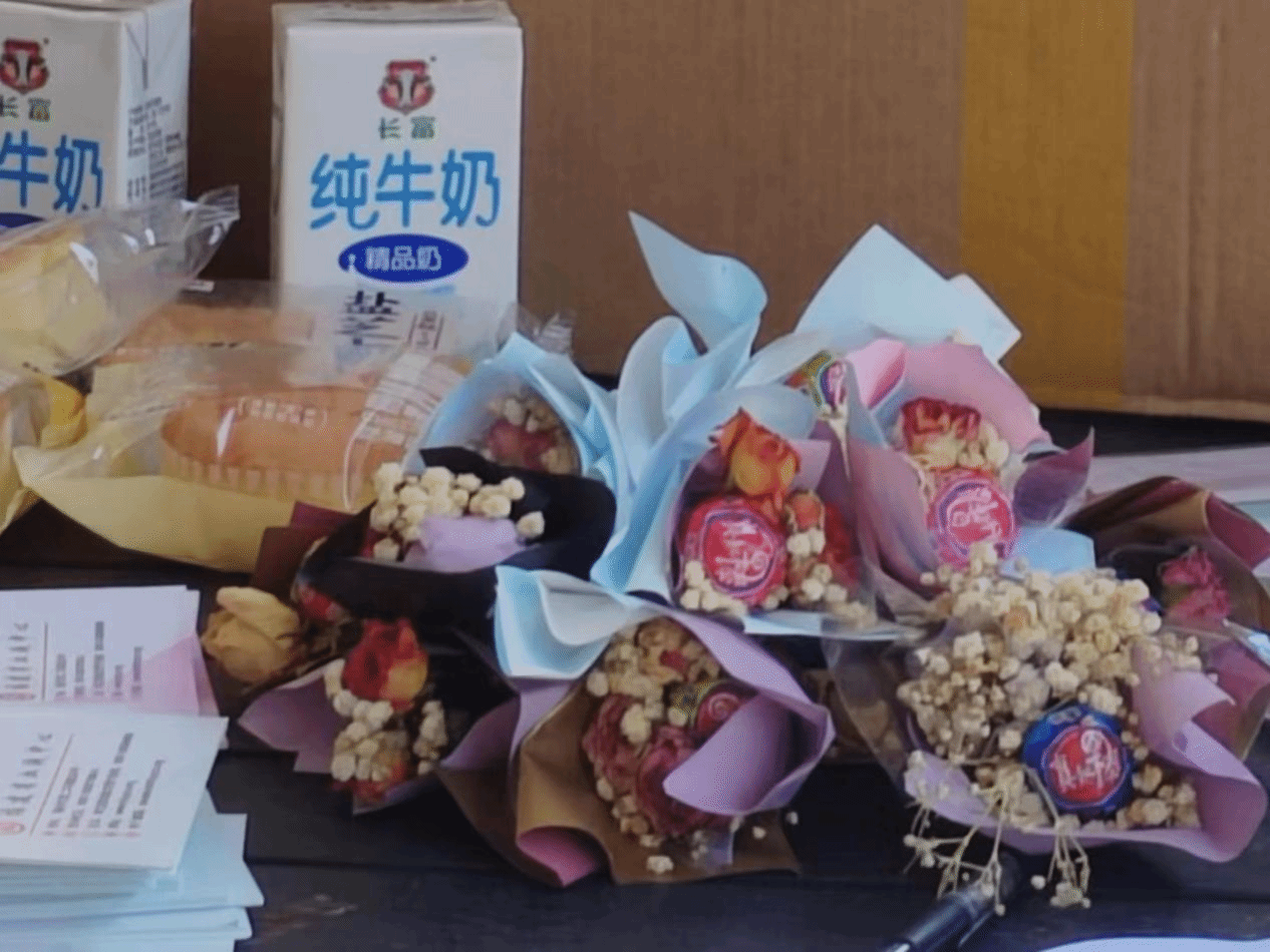 志愿者们还提前布置了休息区,为献血后的师生准备葡萄糖水、面包、牛奶等补给品,还有小柳小学的同学们亲手制作的爱心花束。