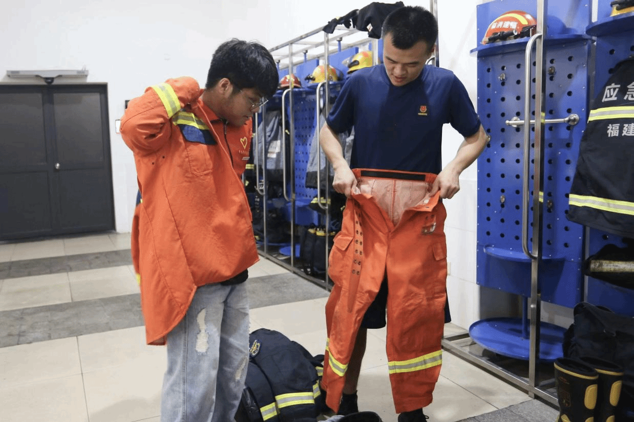 在互动体验中,两位同学分别尝试穿戴了消防服,沉重的消防服让体验的学生稍有移步都倍感压力,这使同学们更加深切感受到了消防员开展灭火工作的艰辛与不易。