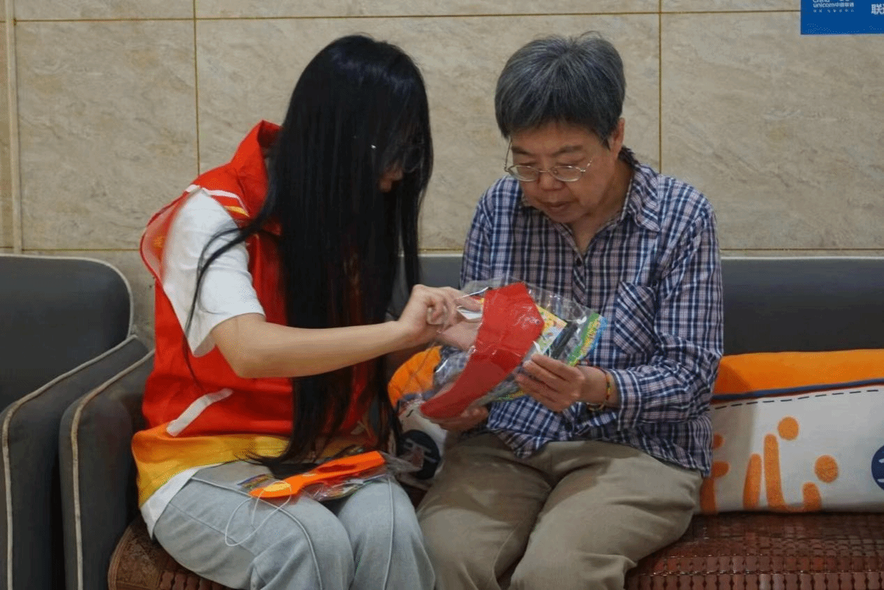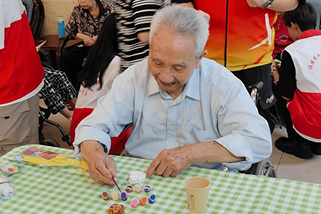 随后,青年志愿者陪伴长者们一起DIY制作领带和石膏娃娃,爷爷奶奶们拿起画笔,根据自己的喜好,绘出可爱的图案。画完图,志愿者们又带着爷爷奶奶们起身活动,进行投壶小游戏,现场欢声笑语不断,园区内弥漫着温馨的节日氛围。
